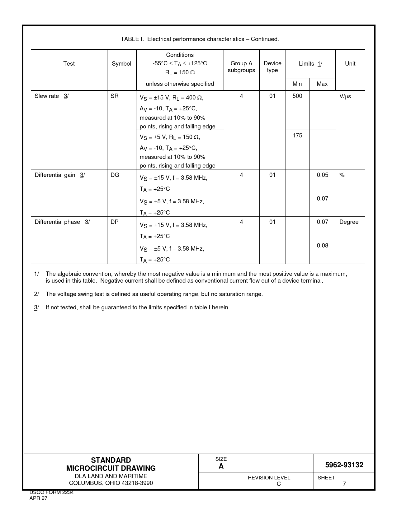 TABLE I. Electrical performance characteristics – Continued. Conditions Test Symbol -55°C ≤ TA ≤ +125°C Group A Device Limits 1/ Unit R subgroups type L = 150 Ω unless otherwise specified Min Max Slew rate 3/ SR V 4 01 500 V/µs S = ±15 V, RL = 400 Ω, AV = -10, TA = +25°C, measured at 10% to 90% points, rising and falling edge V 175 S = ±5 V, RL = 150 Ω, AV = -10, TA = +25°C, measured at 10% to 90% points, rising and falling edge Differential gain 3/ DG 4 01 0.05 % VS = ±15 V, f = 3.58 MHz, TA = +25°C 0.07 VS = ±5 V, f = 3.58 MHz, TA = +25°C Differential phase 3/ DP 4 01 0.07 Degree VS = ±15 V, f = 3.58 MHz, TA = +25°C 0.08 VS = ±5 V, f = 3.58 MHz, TA = +25°C 1/ The algebraic convention, whereby the most negative value is a minimum and the most positive value is a maximum, is used in this table. Negative current shall be defined as conventional current flow out of a device terminal. 2/ The voltage swing test is defined as useful operating range, but no saturation range. 3/ If not tested, shall be guaranteed to the limits specified in table I herein. STANDARD SIZE 5962-93132MICROCIRCUIT DRAWINGA DLA LAND AND MARITIME REVISION LEVEL SHEET COLUMBUS, OHIO 43218-3990 C 7 DSCC FORM 2234 APR 97 Document Outline DEPARTMENT OF DEFENSE SPECIFICATION DEPARTMENT OF DEFENSE STANDARDS