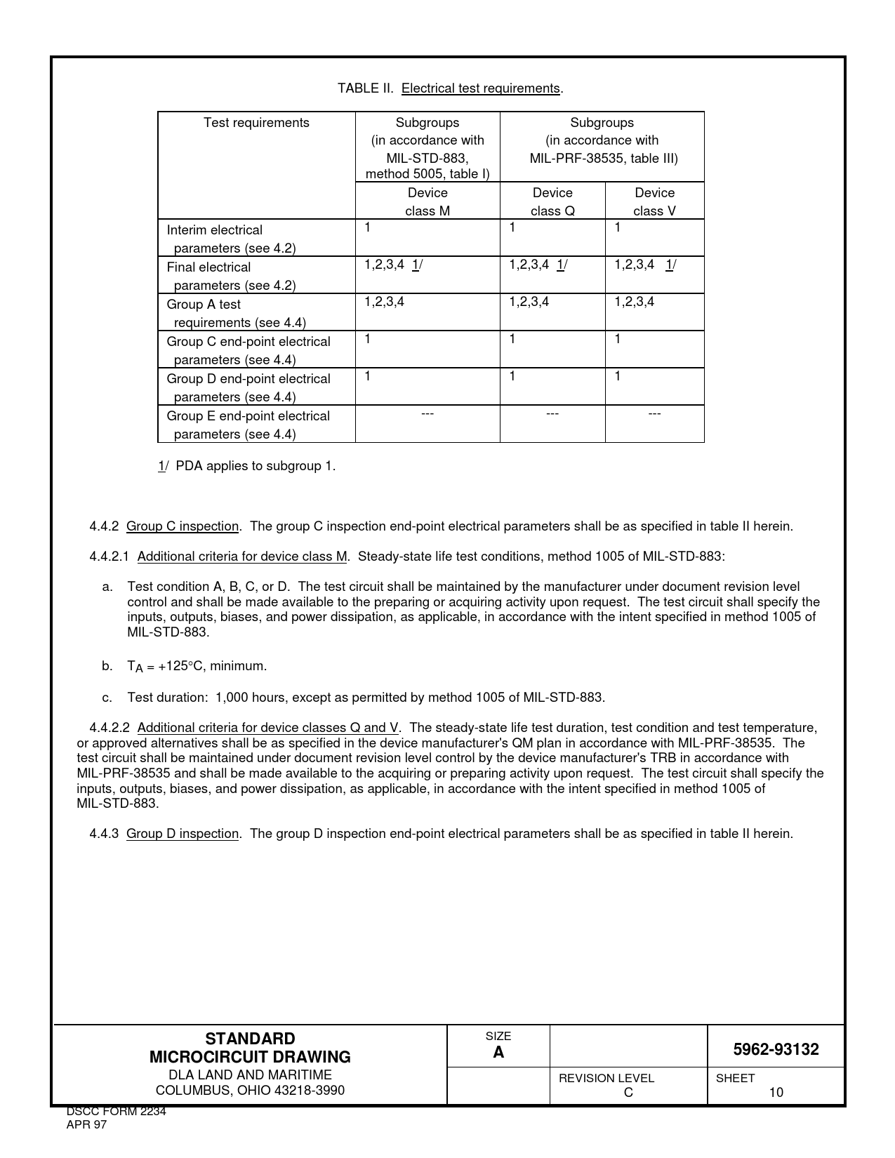 TABLE II. Electrical test requirements. Test requirements Subgroups Subgroups (in accordance with (in accordance with MIL-STD-883, MIL-PRF-38535, table III) method 5005, table I) Device Device Device class M class Q class V Interim electrical 1 1 1 parameters (see 4.2) Final electrical 1,2,3,4 1/ 1,2,3,4 1/ 1,2,3,4 1/ parameters (see 4.2) Group A test 1,2,3,4 1,2,3,4 1,2,3,4 requirements (see 4.4) Group C end-point electrical 1 1 1 parameters (see 4.4) Group D end-point electrical 1 1 1 parameters (see 4.4) Group E end-point electrical --- --- --- parameters (see 4.4) 1/ PDA applies to subgroup 1. 4.4.2 Group C inspection. The group C inspection end-point electrical parameters shall be as specified in table II herein. 4.4.2.1 Additional criteria for device class M. Steady-state life test conditions, method 1005 of MIL-STD-883: a. Test condition A, B, C, or D. The test circuit shall be maintained by the manufacturer under document revision level control and shall be made available to the preparing or acquiring activity upon request. The test circuit shall specify the inputs, outputs, biases, and power dissipation, as applicable, in accordance with the intent specified in method 1005 of MIL-STD-883. b. TA = +125°C, minimum. c. Test duration: 1,000 hours, except as permitted by method 1005 of MIL-STD-883. 4.4.2.2 Additional criteria for device classes Q and V. The steady-state life test duration, test condition and test temperature, or approved alternatives shall be as specified in the device manufacturer's QM plan in accordance with MIL-PRF-38535. The test circuit shall be maintained under document revision level control by the device manufacturer's TRB in accordance with MIL-PRF-38535 and shall be made available to the acquiring or preparing activity upon request. The test circuit shall specify the inputs, outputs, biases, and power dissipation, as applicable, in accordance with the intent specified in method 1005 of MIL-STD-883. 4.4.3 Group D inspection. The group D inspection end-point electrical parameters shall be as specified in table II herein.