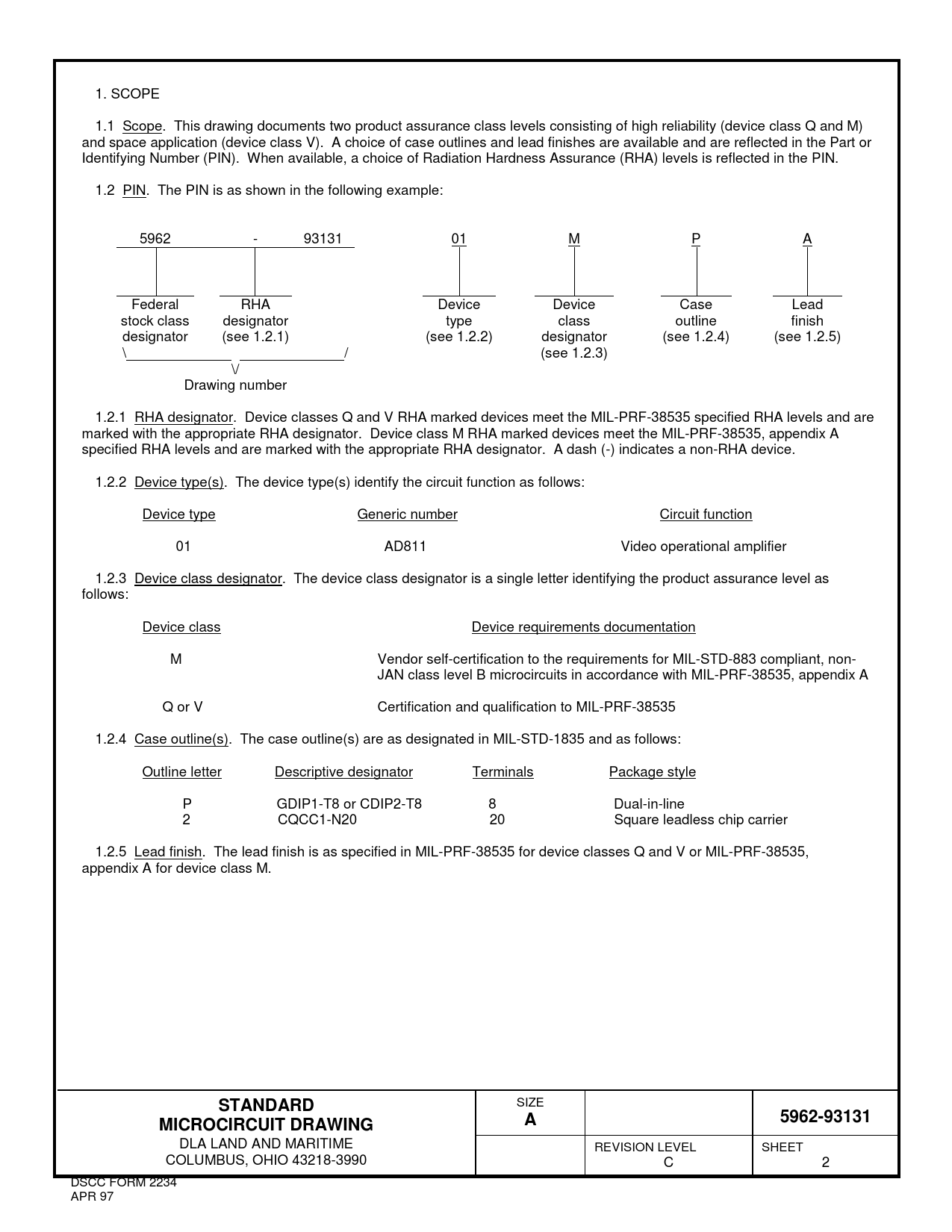 1. SCOPE 1.1 Scope. This drawing documents two product assurance class levels consisting of high reliability (device class Q and M) and space application (device class V). A choice of case outlines and lead finishes are available and are reflected in the Part or Identifying Number (PIN). When available, a choice of Radiation Hardness Assurance (RHA) levels is reflected in the PIN. 1.2 PIN. The PIN is as shown in the following example: 5962 - 93131 01 M P A Federal RHA Device Device Case Lead stock class designator type class outline finish designator (see 1.2.1) (see 1.2.2) designator (see 1.2.4) (see 1.2.5) \ / (see 1.2.3) \/ Drawing number 1.2.1 RHA designator. Device classes Q and V RHA marked devices meet the MIL-PRF-38535 specified RHA levels and are marked with the appropriate RHA designator. Device class M RHA marked devices meet the MIL-PRF-38535, appendix A specified RHA levels and are marked with the appropriate RHA designator. A dash (-) indicates a non-RHA device. 1.2.2 Device type(s). The device type(s) identify the circuit function as follows: Device type Generic number Circuit function 01 AD811 Video operational amplifier 1.2.3 Device class designator. The device class designator is a single letter identifying the product assurance level as follows: Device class Device requirements documentation M Vendor self-certification to the requirements for MIL-STD-883 compliant, non- JAN class level B microcircuits in accordance with MIL-PRF-38535, appendix A Q or V Certification and qualification to MIL-PRF-38535 1.2.4 Case outline(s). The case outline(s) are as designated in MIL-STD-1835 and as follows: Outline letter Descriptive designator Terminals Package style P GDIP1-T8 or CDIP2-T8 8 Dual-in-line 2 CQCC1-N20 20 Square leadless chip carrier 1.2.5 Lead finish. The lead finish is as specified in MIL-PRF-38535 for device classes Q and V or MIL-PRF-38535, appendix A for device class M.