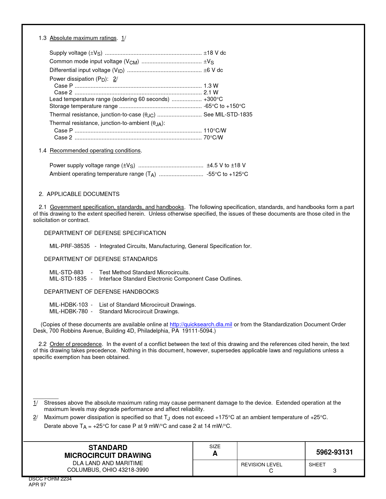 1.3 Absolute maximum ratings. 1/ Supply voltage (±VS) ... ±18 V dc Common mode input voltage (VCM) .. ±VS Differential input voltage (VID) ... ±6 V dc Power dissipation (PD): 2/ Case P .. 1.3 W Case 2 .. 2.1 W Lead temperature range (soldering 60 seconds) ... +300°C Storage temperature range .. -65°C to +150°C Thermal resistance, junction-to-case (θJC) .. See MIL-STD-1835 Thermal resistance, junction-to-ambient (θJA): Case P .. 110°C/W Case 2 .. 70°C/W 1.4 Recommended operating conditions. Power supply voltage range (±VS) ... ±4.5 V to ±18 V Ambient operating temperature range (TA) .. -55°C to +125°C 2. APPLICABLE DOCUMENTS 2.1 Government specification, standards, and handbooks. The following specification, standards, and handbooks form a part of this drawing to the extent specified herein. Unless otherwise specified, the issues of these documents are those cited in the solicitation or contract. DEPARTMENT OF DEFENSE SPECIFICATION MIL-PRF-38535 - Integrated Circuits, Manufacturing, General Specification for. DEPARTMENT OF DEFENSE STANDARDS MIL-STD-883 - Test Method Standard Microcircuits. MIL-STD-1835 - Interface Standard Electronic Component Case Outlines. DEPARTMENT OF DEFENSE HANDBOOKS MIL-HDBK-103 - List of Standard Microcircuit Drawings. MIL-HDBK-780 - Standard Microcircuit Drawings. (Copies of these documents are available online at http://quicksearch.dla.mil or from the Standardization Document Order Desk, 700 Robbins Avenue, Building 4D, Philadelphia, PA 19111-5094.) 2.2 Order of precedence. In the event of a conflict between the text of this drawing and the references cited herein, the text of this drawing takes precedence. Nothing in this document, however, supersedes applicable laws and regulations unless a specific exemption has been obtained. ________ 1/ Stresses above the absolute maximum rating may cause permanent damage to the device. Extended operation at the maximum levels may degrade performance and affect reliability. 2/ Maximum power dissipation is specified so that TJ does not exceed +175°C at an ambient temperature of +25°C. Derate above TA = +25°C for case P at 9 mW/°C and case 2 at 14 mW/°C.