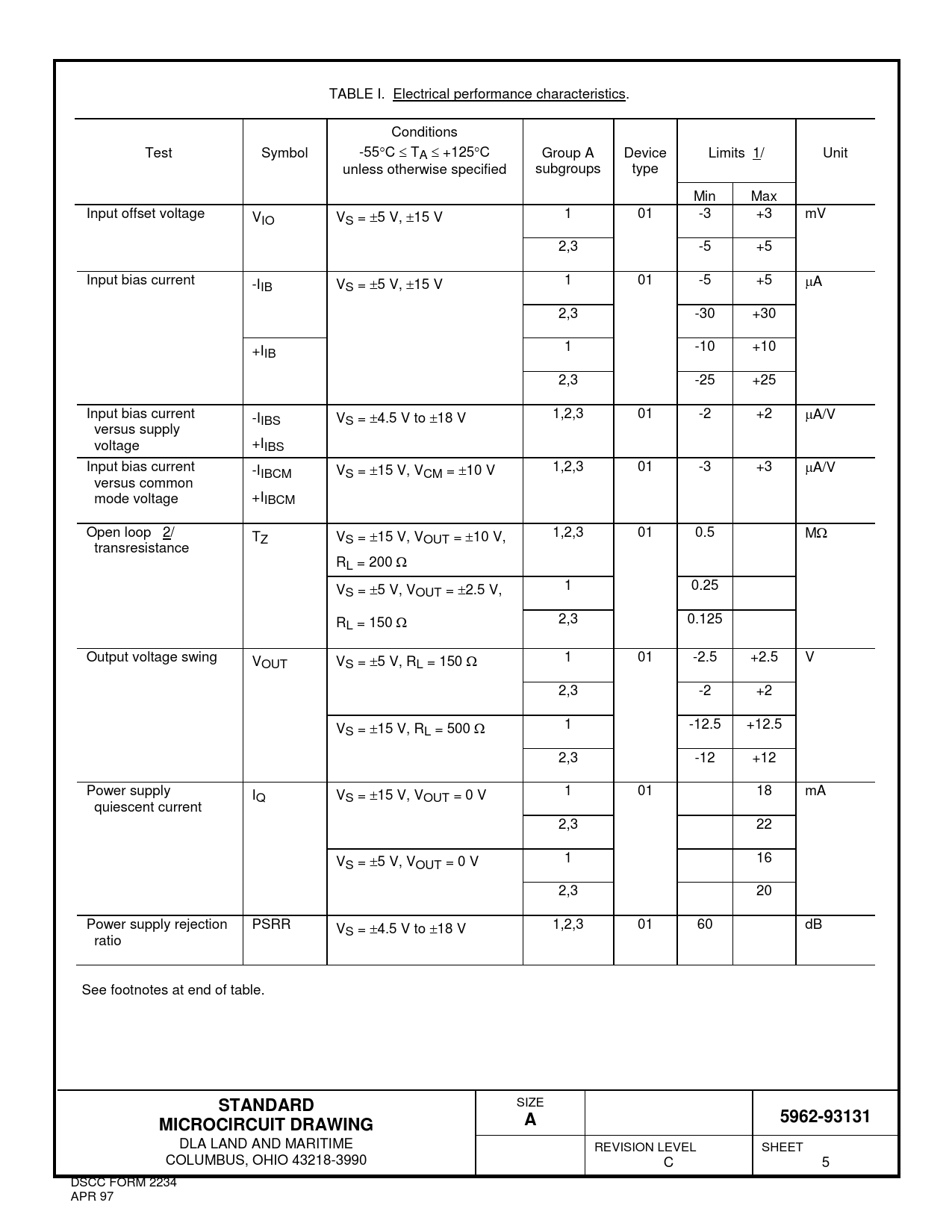 TABLE I. Electrical performance characteristics. Conditions Test Symbol -55°C ≤ TA ≤ +125°C Group A Device Limits 1/ Unit unless otherwise specified subgroups type Min Max Input offset voltage VIO VS = ±5 V, ±15 V 1 01 -3 +3 mV 2,3 -5 +5 Input bias current -IIB VS = ±5 V, ±15 V 1 01 -5 +5 µA 2,3 -30 +30 +IIB 1 -10 +10 2,3 -25 +25 Input bias current -IIBS VS = ±4.5 V to ±18 V 1,2,3 01 -2 +2 µA/V versus supply voltage +IIBS Input bias current -IIBCM VS = ±15 V, VCM = ±10 V 1,2,3 01 -3 +3 µA/V versus common mode voltage +IIBCM Open loop 2/ T 1,2,3 01 0.5 MΩ Z VS = ±15 V, VOUT = ±10 V, transresistance RL = 200 Ω VS = ±5 V, VOUT = ±2.5 V, 1 0.25 R 2,3 0.125 L = 150 Ω Output voltage swing VOUT VS = ±5 V, RL = 150 Ω 1 01 -2.5 +2.5 V 2,3 -2 +2 VS = ±15 V, RL = 500 Ω 1 -12.5 +12.5 2,3 -12 +12 Power supply IQ VS = ±15 V, VOUT = 0 V 1 01 18 mA quiescent current 2,3 22 VS = ±5 V, VOUT = 0 V 1 16 2,3 20 Power supply rejection PSRR VS = ±4.5 V to ±18 V 1,2,3 01 60 dB ratio See footnotes at end of table. STANDARD SIZE 5962-93131MICROCIRCUIT DRAWINGA DLA LAND AND MARITIME REVISION LEVEL SHEET COLUMBUS, OHIO 43218-3990 C 5 DSCC FORM 2234 APR 97 Document Outline DEPARTMENT OF DEFENSE SPECIFICATION DEPARTMENT OF DEFENSE STANDARDS