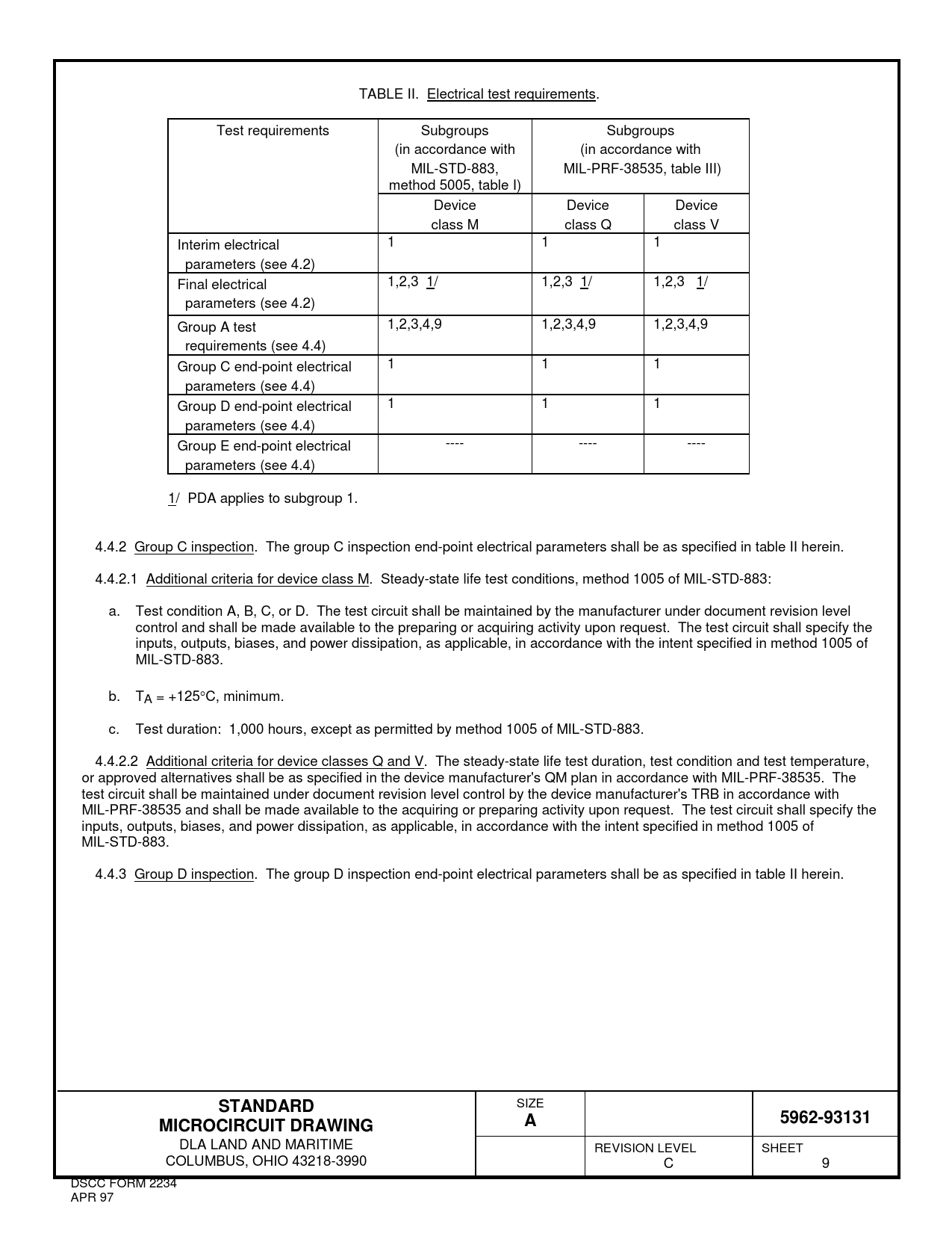 TABLE II. Electrical test requirements. Test requirements Subgroups Subgroups (in accordance with (in accordance with MIL-STD-883, MIL-PRF-38535, table III) method 5005, table I) Device Device Device class M class Q class V Interim electrical 1 1 1 parameters (see 4.2) Final electrical 1,2,3 1/ 1,2,3 1/ 1,2,3 1/ parameters (see 4.2) Group A test 1,2,3,4,9 1,2,3,4,9 1,2,3,4,9 requirements (see 4.4) Group C end-point electrical 1 1 1 parameters (see 4.4) Group D end-point electrical 1 1 1 parameters (see 4.4) Group E end-point electrical ---- ---- ---- parameters (see 4.4) 1/ PDA applies to subgroup 1. 4.4.2 Group C inspection. The group C inspection end-point electrical parameters shall be as specified in table II herein. 4.4.2.1 Additional criteria for device class M. Steady-state life test conditions, method 1005 of MIL-STD-883: a. Test condition A, B, C, or D. The test circuit shall be maintained by the manufacturer under document revision level control and shall be made available to the preparing or acquiring activity upon request. The test circuit shall specify the inputs, outputs, biases, and power dissipation, as applicable, in accordance with the intent specified in method 1005 of MIL-STD-883. b. TA = +125°C, minimum. c. Test duration: 1,000 hours, except as permitted by method 1005 of MIL-STD-883. 4.4.2.2 Additional criteria for device classes Q and V. The steady-state life test duration, test condition and test temperature, or approved alternatives shall be as specified in the device manufacturer's QM plan in accordance with MIL-PRF-38535. The test circuit shall be maintained under document revision level control by the device manufacturer's TRB in accordance with MIL-PRF-38535 and shall be made available to the acquiring or preparing activity upon request. The test circuit shall specify the inputs, outputs, biases, and power dissipation, as applicable, in accordance with the intent specified in method 1005 of MIL-STD-883. 4.4.3 Group D inspection. The group D inspection end-point electrical parameters shall be as specified in table II herein. STANDARD SIZE 5962-93131MICROCIRCUIT DRAWINGA DLA LAND AND MARITIME REVISION LEVEL SHEET COLUMBUS, OHIO 43218-3990 C 9 DSCC FORM 2234 APR 97 Document Outline DEPARTMENT OF DEFENSE SPECIFICATION DEPARTMENT OF DEFENSE STANDARDS