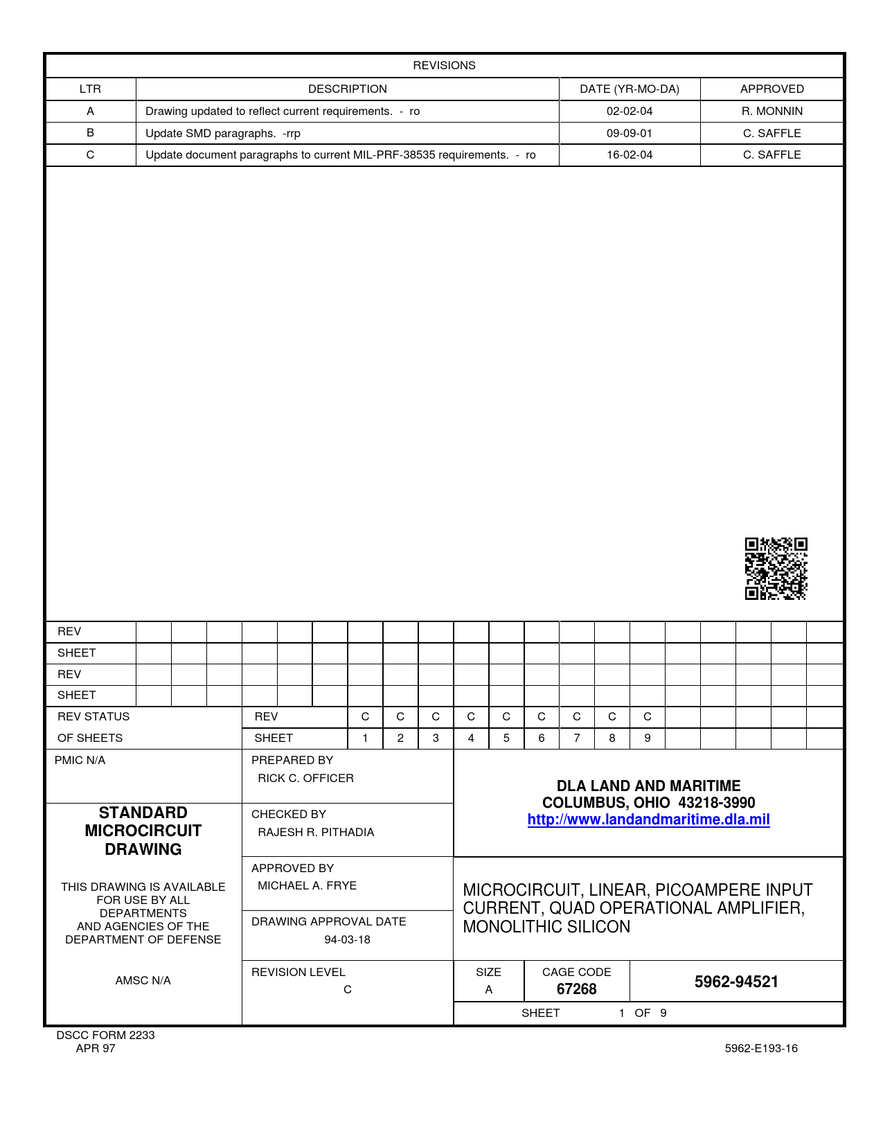 REVISIONS LTR DESCRIPTION DATE (YR-MO-DA) APPROVED A Drawing updated to reflect current requirements. - ro 02-02-04 R. MONNIN B Update SMD paragraphs. -rrp 09-09-01 C. SAFFLE C Update document paragraphs to current MIL-PRF-38535 requirements. - ro 16-02-04 C. SAFFLE REV SHEET REV SHEET REV STATUS REV C C C C C C C C C OF SHEETS SHEET 1 2 3 4 5 6 7 8 9 PMIC N/A PREPARED BY RICK C. OFFICER DLA LAND AND MARITIMECOLUMBUS, OHIO 43218-3990STANDARD CHECKED BY http://www.landandmaritime.dla.milMICROCIRCUIT RAJESH R. PITHADIA DRAWING APPROVED BY THIS DRAWING IS AVAILABLE MICHAEL A. FRYE MICROCIRCUIT, LINEAR, PICOAMPERE INPUT FOR USE BY ALL DEPARTMENTS CURRENT, QUAD OPERATIONAL AMPLIFIER, AND AGENCIES OF THE DRAWING APPROVAL DATE MONOLITHIC SILICON DEPARTMENT OF DEFENSE 94-03-18 REVISION LEVEL SIZE CAGE CODE AMSC N/A 5962-94521 C A 67268 SHEET 1 OF 9 DSCC FORM 2233 APR 97 5962-E193-16