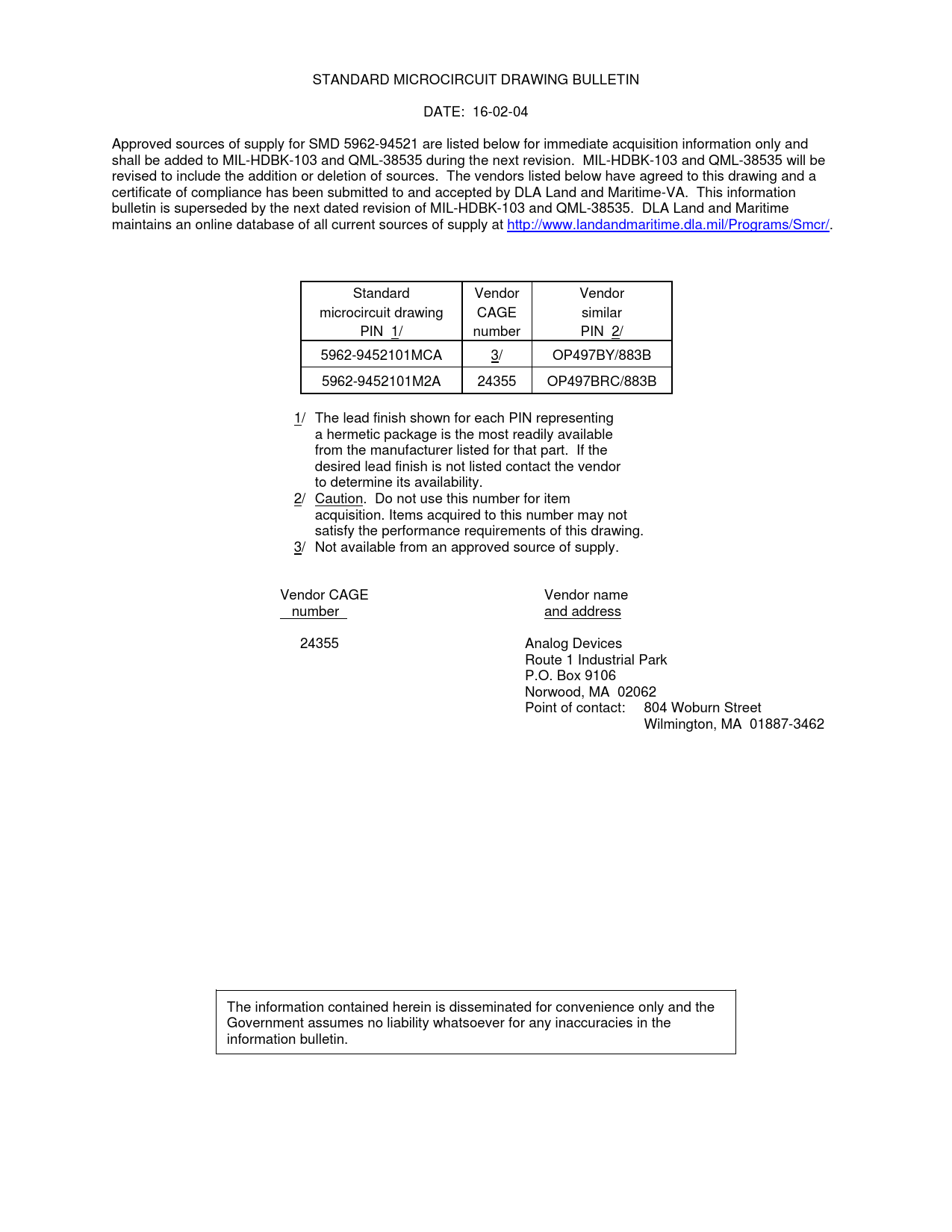 STANDARD MICROCIRCUIT DRAWING BULLETIN DATE: 16-02-04 Approved sources of supply for SMD 5962-94521 are listed below for immediate acquisition information only and shall be added to MIL-HDBK-103 and QML-38535 during the next revision. MIL-HDBK-103 and QML-38535 will be revised to include the addition or deletion of sources. The vendors listed below have agreed to this drawing and a certificate of compliance has been submitted to and accepted by DLA Land and Maritime-VA. This information bulletin is superseded by the next dated revision of MIL-HDBK-103 and QML-38535. DLA Land and Maritime maintains an online database of all current sources of supply at http://www.landandmaritime.dla.mil/Programs/Smcr/. Standard Vendor Vendor microcircuit drawing CAGE similar PIN 1/ number PIN 2/ 5962-9452101MCA 3/ OP497BY/883B 5962-9452101M2A 24355 OP497BRC/883B 1/ The lead finish shown for each PIN representing a hermetic package is the most readily available from the manufacturer listed for that part. If the desired lead finish is not listed contact the vendor to determine its availability. 2/ Caution. Do not use this number for item acquisition. Items acquired to this number may not satisfy the performance requirements of this drawing. 3/ Not available from an approved source of supply. Vendor CAGE Vendor name number and address 24355 Analog Devices Route 1 Industrial Park P.O. Box 9106 Norwood, MA 02062 Point of contact: 804 Woburn Street Wilmington, MA 01887-3462 The information contained herein is disseminated for convenience only and the Government assumes no liability whatsoever for any inaccuracies in the information bulletin.