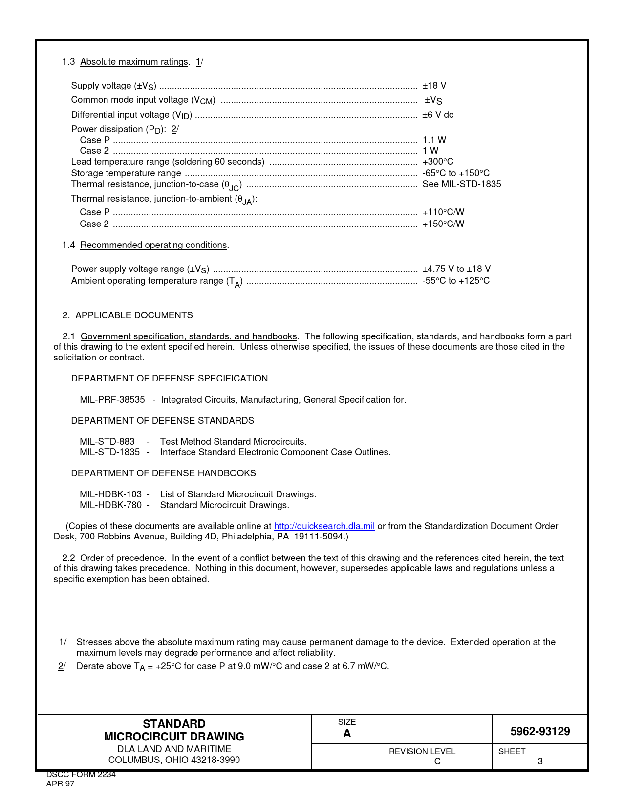 1.3 Absolute maximum ratings. 1/ Supply voltage (±VS) ... ±18 V Common mode input voltage (VCM) ... ±VS Differential input voltage (VID) ... ±6 V dc Power dissipation (PD): 2/ Case P ... 1.1 W Case 2 ... 1 W Lead temperature range (soldering 60 seconds) .. +300°C Storage temperature range ... -65°C to +150°C Thermal resistance, junction-to-case (θ ) ... See MIL-STD-1835 JC Thermal resistance, junction-to-ambient (θ ): JA Case P ... +110°C/W Case 2 ... +150°C/W 1.4 Recommended operating conditions. Power supply voltage range (±VS) .. ±4.75 V to ±18 V Ambient operating temperature range (T ) ... -55°C to +125°C A 2. APPLICABLE DOCUMENTS 2.1 Government specification, standards, and handbooks. The following specification, standards, and handbooks form a part of this drawing to the extent specified herein. Unless otherwise specified, the issues of these documents are those cited in the solicitation or contract. DEPARTMENT OF DEFENSE SPECIFICATION MIL-PRF-38535 - Integrated Circuits, Manufacturing, General Specification for. DEPARTMENT OF DEFENSE STANDARDS MIL-STD-883 - Test Method Standard Microcircuits. MIL-STD-1835 - Interface Standard Electronic Component Case Outlines. DEPARTMENT OF DEFENSE HANDBOOKS MIL-HDBK-103 - List of Standard Microcircuit Drawings. MIL-HDBK-780 - Standard Microcircuit Drawings. (Copies of these documents are available online at http://quicksearch.dla.mil or from the Standardization Document Order Desk, 700 Robbins Avenue, Building 4D, Philadelphia, PA 19111-5094.) 2.2 Order of precedence. In the event of a conflict between the text of this drawing and the references cited herein, the text of this drawing takes precedence. Nothing in this document, however, supersedes applicable laws and regulations unless a specific exemption has been obtained. ______ 1/ Stresses above the absolute maximum rating may cause permanent damage to the device. Extended operation at the maximum levels may degrade performance and affect reliability. 2/ Derate above TA = +25°C for case P at 9.0 mW/°C and case 2 at 6.7 mW/°C.