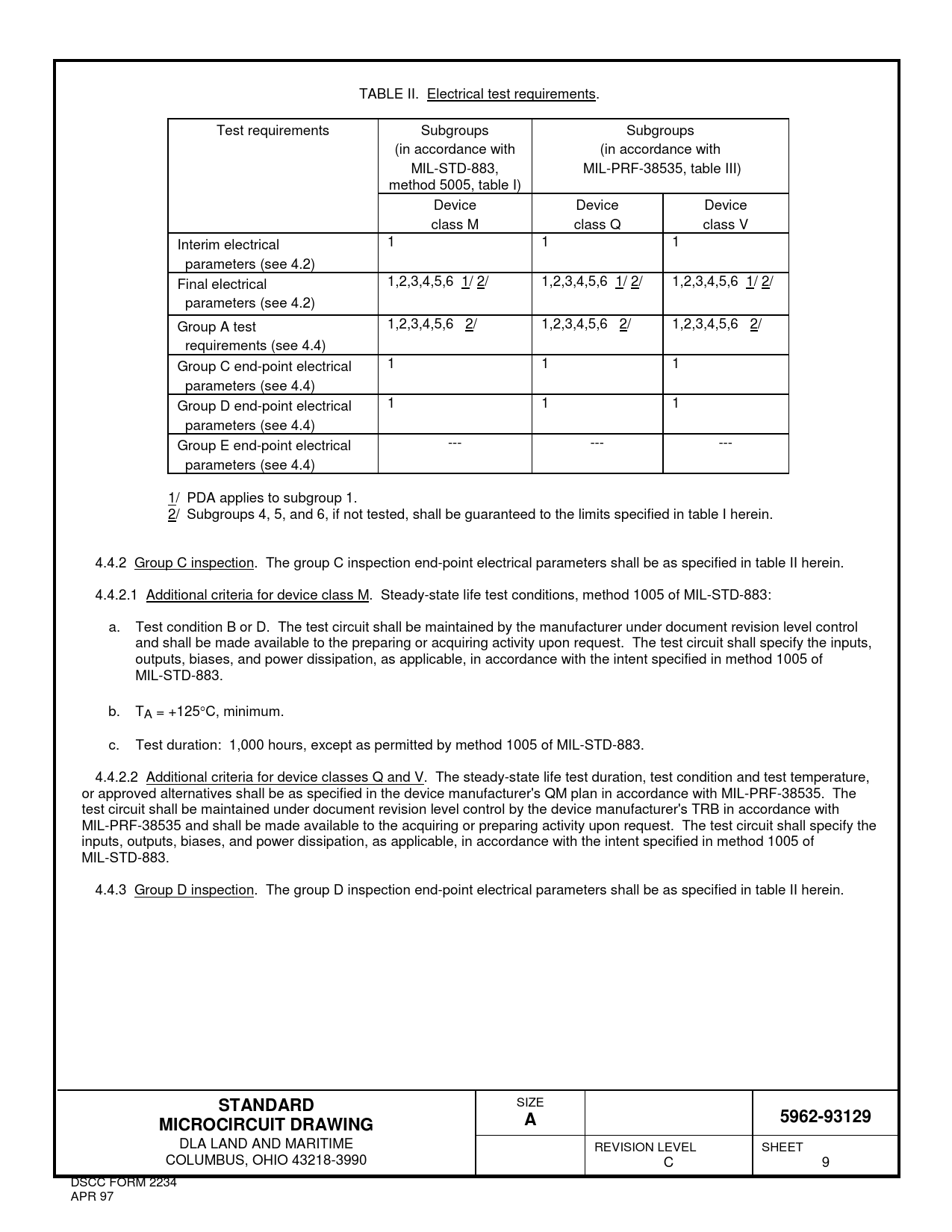 TABLE II. Electrical test requirements. Test requirements Subgroups Subgroups (in accordance with (in accordance with MIL-STD-883, MIL-PRF-38535, table III) method 5005, table I) Device Device Device class M class Q class V Interim electrical 1 1 1 parameters (see 4.2) Final electrical 1,2,3,4,5,6 1/ 2/ 1,2,3,4,5,6 1/ 2/ 1,2,3,4,5,6 1/ 2/ parameters (see 4.2) Group A test 1,2,3,4,5,6 2/ 1,2,3,4,5,6 2/ 1,2,3,4,5,6 2/ requirements (see 4.4) Group C end-point electrical 1 1 1 parameters (see 4.4) Group D end-point electrical 1 1 1 parameters (see 4.4) Group E end-point electrical --- --- --- parameters (see 4.4) 1/ PDA applies to subgroup 1. 2/ Subgroups 4, 5, and 6, if not tested, shall be guaranteed to the limits specified in table I herein. 4.4.2 Group C inspection. The group C inspection end-point electrical parameters shall be as specified in table II herein. 4.4.2.1 Additional criteria for device class M. Steady-state life test conditions, method 1005 of MIL-STD-883: a. Test condition B or D. The test circuit shall be maintained by the manufacturer under document revision level control and shall be made available to the preparing or acquiring activity upon request. The test circuit shall specify the inputs, outputs, biases, and power dissipation, as applicable, in accordance with the intent specified in method 1005 of MIL-STD-883. b. TA = +125°C, minimum. c. Test duration: 1,000 hours, except as permitted by method 1005 of MIL-STD-883. 4.4.2.2 Additional criteria for device classes Q and V. The steady-state life test duration, test condition and test temperature, or approved alternatives shall be as specified in the device manufacturer's QM plan in accordance with MIL-PRF-38535. The test circuit shall be maintained under document revision level control by the device manufacturer's TRB in accordance with MIL-PRF-38535 and shall be made available to the acquiring or preparing activity upon request. The test circuit shall specify the inputs, outputs, biases, and power dissipation, as applicable, in accordance with the intent specified in method 1005 of MIL-STD-883. 4.4.3 Group D inspection. The group D inspection end-point electrical parameters shall be as specified in table II herein.