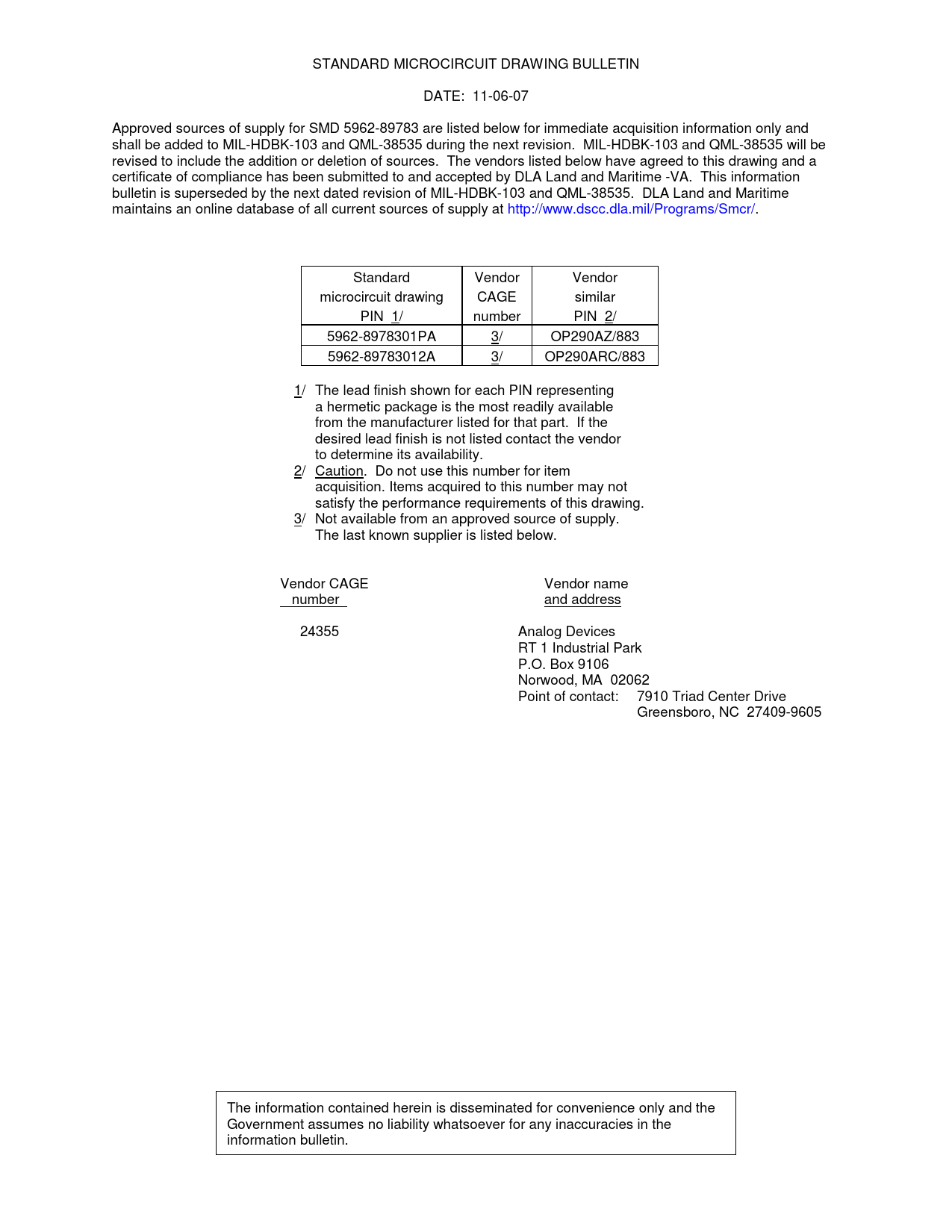STANDARD MICROCIRCUIT DRAWING BULLETIN DATE: 11-06-07 Approved sources of supply for SMD 5962-89783 are listed below for immediate acquisition information only and shall be added to MIL-HDBK-103 and QML-38535 during the next revision. MIL-HDBK-103 and QML-38535 will be revised to include the addition or deletion of sources. The vendors listed below have agreed to this drawing and a certificate of compliance has been submitted to and accepted by DLA Land and Maritime -VA. This information bulletin is superseded by the next dated revision of MIL-HDBK-103 and QML-38535. DLA Land and Maritime maintains an online database of all current sources of supply at http://www.dscc.dla.mil/Programs/Smcr/. Standard Vendor Vendor microcircuit drawing CAGE similar PIN 1/ number PIN 2/ 5962-8978301PA 3/ OP290AZ/883 5962-89783012A 3/ OP290ARC/883 1/ The lead finish shown for each PIN representing a hermetic package is the most readily available from the manufacturer listed for that part. If the desired lead finish is not listed contact the vendor to determine its availability. 2/ Caution. Do not use this number for item acquisition. Items acquired to this number may not satisfy the performance requirements of this drawing. 3/ Not available from an approved source of supply. The last known supplier is listed below. Vendor CAGE Vendor name number and address 24355 Analog Devices RT 1 Industrial Park P.O. Box 9106 Norwood, MA 02062 Point of contact: 7910 Triad Center Drive Greensboro, NC 27409-9605 The information contained herein is disseminated for convenience only and the Government assumes no liability whatsoever for any inaccuracies in the information bulletin.