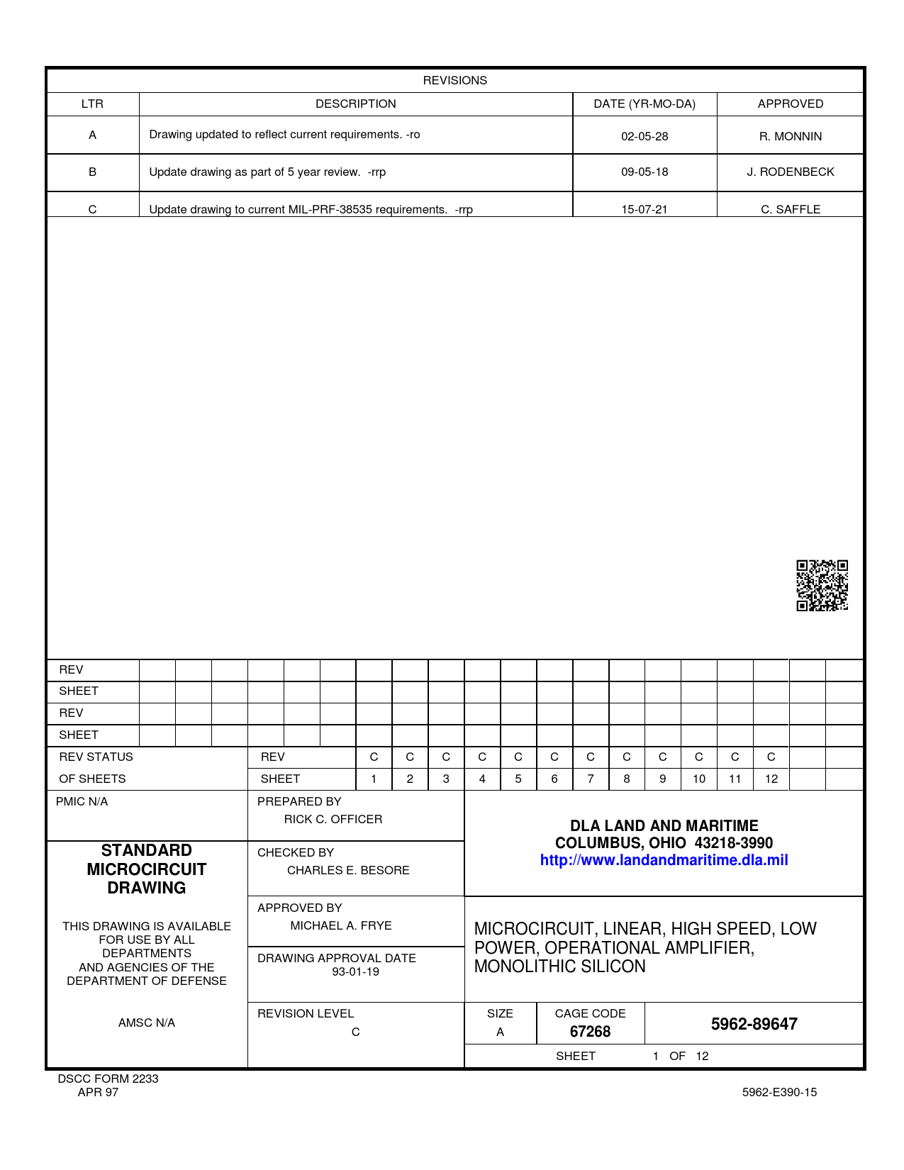 REVISIONS LTR DESCRIPTION DATE (YR-MO-DA) APPROVED A Drawing updated to reflect current requirements. -ro 02-05-28 R. MONNIN B Update drawing as part of 5 year review. -rrp 09-05-18 J. RODENBECK C Update drawing to current MIL-PRF-38535 requirements. -rrp 15-07-21 C. SAFFLE REV SHEET REV SHEET REV STATUS REV C C C C C C C C C C C C OF SHEETS SHEET 1 2 3 4 5 6 7 8 9 10 11 12 PMIC N/A PREPARED BY RICK C. OFFICER DLA LAND AND MARITIMECOLUMBUS, OHIO 43218-3990STANDARD CHECKED BY http://www.landandmaritime.dla.milMICROCIRCUIT CHARLES E. BESORE DRAWING APPROVED BY THIS DRAWING IS AVAILABLE MICHAEL A. FRYE MICROCIRCUIT, LINEAR, HIGH SPEED, LOW FOR USE BY ALL DEPARTMENTS POWER, OPERATIONAL AMPLIFIER, DRAWING APPROVAL DATE AND AGENCIES OF THE MONOLITHIC SILICON 93-01-19 DEPARTMENT OF DEFENSE REVISION LEVEL SIZE CAGE CODE AMSC N/A 5962-89647 C A 67268 SHEET 1 OF 12 DSCC FORM 2233 APR 97 5962-E390-15