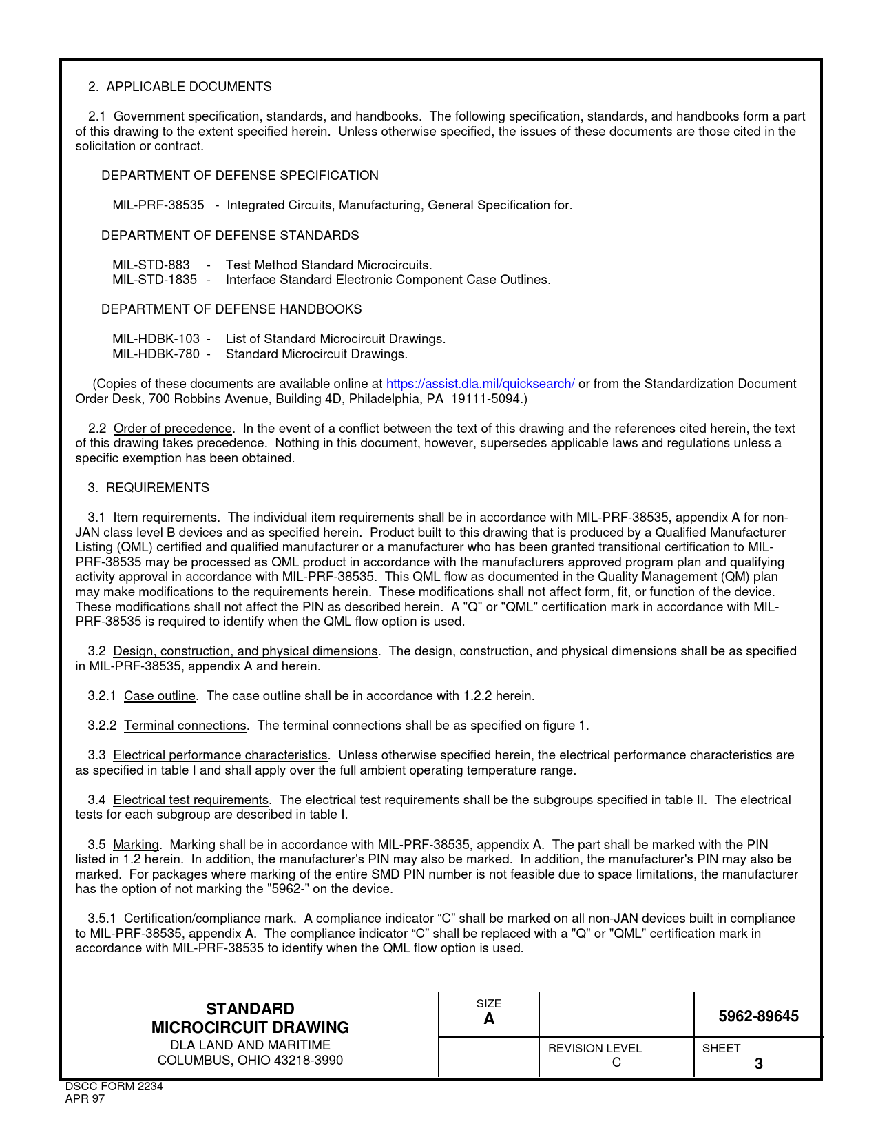 2. APPLICABLE DOCUMENTS 2.1 Government specification, standards, and handbooks. The following specification, standards, and handbooks form a part of this drawing to the extent specified herein. Unless otherwise specified, the issues of these documents are those cited in the solicitation or contract. DEPARTMENT OF DEFENSE SPECIFICATION MIL-PRF-38535 - Integrated Circuits, Manufacturing, General Specification for. DEPARTMENT OF DEFENSE STANDARDS MIL-STD-883 - Test Method Standard Microcircuits. MIL-STD-1835 - Interface Standard Electronic Component Case Outlines. DEPARTMENT OF DEFENSE HANDBOOKS MIL-HDBK-103 - List of Standard Microcircuit Drawings. MIL-HDBK-780 - Standard Microcircuit Drawings. (Copies of these documents are available online at https://assist.dla.mil/quicksearch/ or from the Standardization Document Order Desk, 700 Robbins Avenue, Building 4D, Philadelphia, PA 19111-5094.) 2.2 Order of precedence. In the event of a conflict between the text of this drawing and the references cited herein, the text of this drawing takes precedence. Nothing in this document, however, supersedes applicable laws and regulations unless a specific exemption has been obtained. 3. REQUIREMENTS 3.1 Item requirements. The individual item requirements shall be in accordance with MIL-PRF-38535, appendix A for non- JAN class level B devices and as specified herein. Product built to this drawing that is produced by a Qualified Manufacturer Listing (QML) certified and qualified manufacturer or a manufacturer who has been granted transitional certification to MIL- PRF-38535 may be processed as QML product in accordance with the manufacturers approved program plan and qualifying activity approval in accordance with MIL-PRF-38535. This QML flow as documented in the Quality Management (QM) plan may make modifications to the requirements herein. These modifications shall not affect form, fit, or function of the device. These modifications shall not affect the PIN as described herein. A "Q" or "QML" certification mark in accordance with MIL- PRF-38535 is required to identify when the QML flow option is used. 3.2 Design, construction, and physical dimensions. The design, construction, and physical dimensions shall be as specified in MIL-PRF-38535, appendix A and herein. 3.2.1 Case outline. The case outline shall be in accordance with 1.2.2 herein. 3.2.2 Terminal connections. The terminal connections shall be as specified on figure 1. 3.3 Electrical performance characteristics. Unless otherwise specified herein, the electrical performance characteristics are as specified in table I and shall apply over the full ambient operating temperature range. 3.4 Electrical test requirements. The electrical test requirements shall be the subgroups specified in table II. The electrical tests for each subgroup are described in table I. 3.5 Marking. Marking shall be in accordance with MIL-PRF-38535, appendix A. The part shall be marked with the PIN listed in 1.2 herein. In addition, the manufacturer's PIN may also be marked. In addition, the manufacturer's PIN may also be marked. For packages where marking of the entire SMD PIN number is not feasible due to space limitations, the manufacturer has the option of not marking the "5962-" on the device. 3.5.1 Certification/compliance mark. A compliance indicator “C” shall be marked on all non-JAN devices built in compliance to MIL-PRF-38535, appendix A. The compliance indicator “C” shall be replaced with a "Q" or "QML" certification mark in accordance with MIL-PRF-38535 to identify when the QML flow option is used.