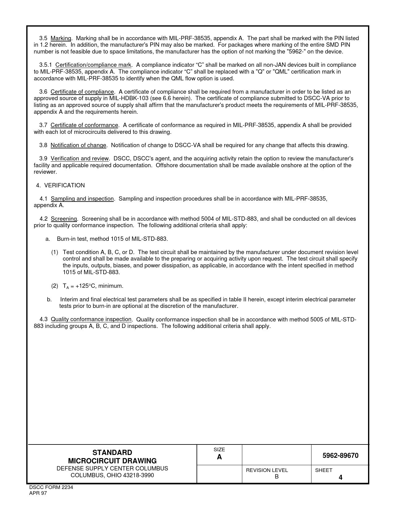 3.5 Marking. Marking shall be in accordance with MIL-PRF-38535, appendix A. The part shall be marked with the PIN listed in 1.2 herein. In addition, the manufacturer's PIN may also be marked. For packages where marking of the entire SMD PIN number is not feasible due to space limitations, the manufacturer has the option of not marking the "5962-" on the device. 3.5.1 Certification/compliance mark. A compliance indicator “C” shall be marked on all non-JAN devices built in compliance to MIL-PRF-38535, appendix A. The compliance indicator “C” shall be replaced with a "Q" or "QML" certification mark in accordance with MIL-PRF-38535 to identify when the QML flow option is used. 3.6 Certificate of compliance. A certificate of compliance shall be required from a manufacturer in order to be listed as an approved source of supply in MIL-HDBK-103 (see 6.6 herein). The certificate of compliance submitted to DSCC-VA prior to listing as an approved source of supply shall affirm that the manufacturer's product meets the requirements of MIL-PRF-38535, appendix A and the requirements herein. 3.7 Certificate of conformance. A certificate of conformance as required in MIL-PRF-38535, appendix A shall be provided with each lot of microcircuits delivered to this drawing. 3.8 Notification of change. Notification of change to DSCC-VA shall be required for any change that affects this drawing. 3.9 Verification and review. DSCC, DSCC's agent, and the acquiring activity retain the option to review the manufacturer's facility and applicable required documentation. Offshore documentation shall be made available onshore at the option of the reviewer. 4. VERIFICATION 4.1 Sampling and inspection. Sampling and inspection procedures shall be in accordance with MIL-PRF-38535, appendix A. 4.2 Screening. Screening shall be in accordance with method 5004 of MIL-STD-883, and shall be conducted on all devices prior to quality conformance inspection. The following additional criteria shall apply: a. Burn-in test, method 1015 of MIL-STD-883. (1) Test condition A, B, C, or D. The test circuit shall be maintained by the manufacturer under document revision level control and shall be made available to the preparing or acquiring activity upon request. The test circuit shall specify the inputs, outputs, biases, and power dissipation, as applicable, in accordance with the intent specified in method 1015 of MIL-STD-883. (2) TA = +125°C, minimum. b. Interim and final electrical test parameters shall be as specified in table II herein, except interim electrical parameter tests prior to burn-in are optional at the discretion of the manufacturer. 4.3 Quality conformance inspection. Quality conformance inspection shall be in accordance with method 5005 of MIL-STD- 883 including groups A, B, C, and D inspections. The following additional criteria shall apply. STANDARD SIZE A5962-89670MICROCIRCUIT DRAWING DEFENSE SUPPLY CENTER COLUMBUS REVISION LEVEL SHEET COLUMBUS, OHIO 43218-3990 B 4 DSCC FORM 2234 APR 97