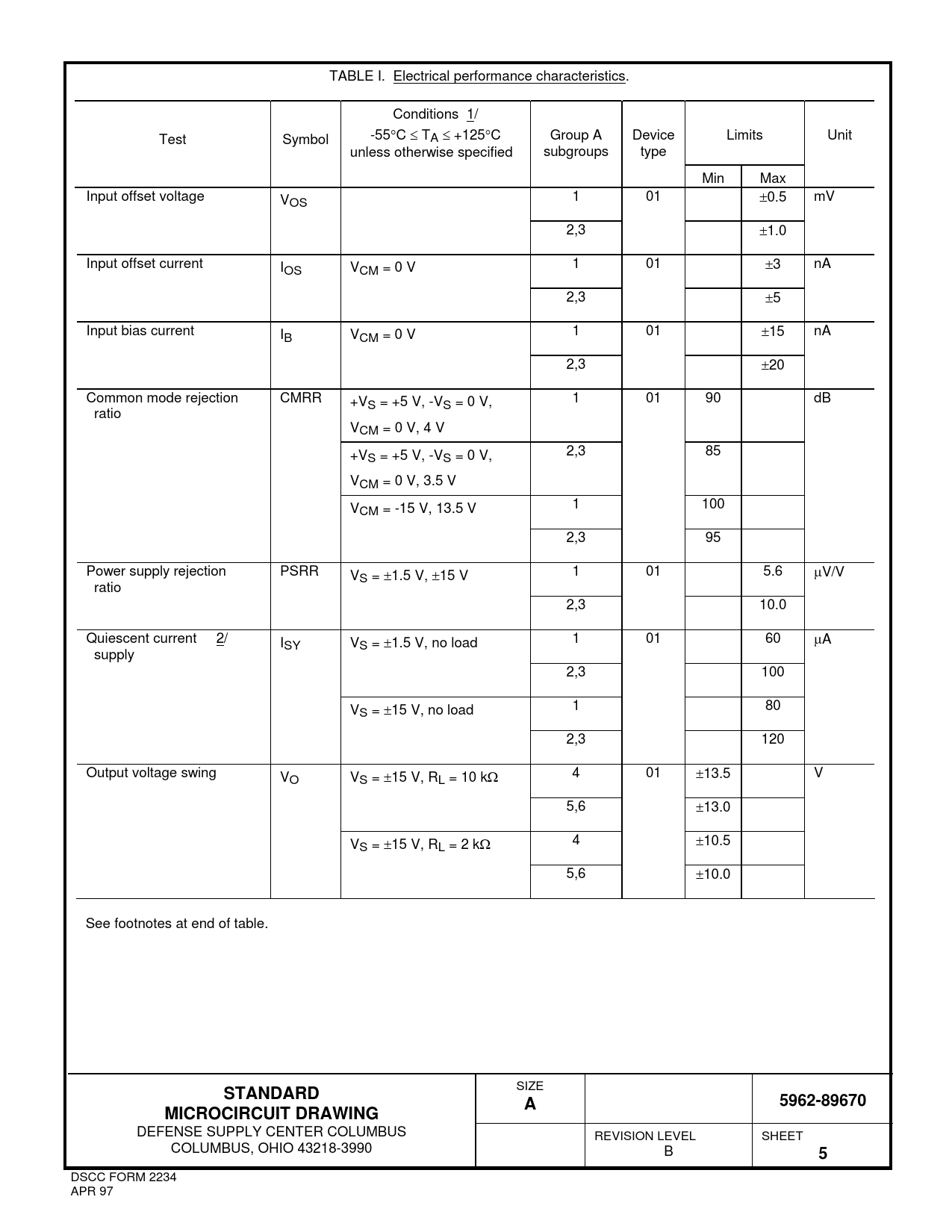 TABLE I. Electrical performance characteristics. Conditions 1/ Test Symbol -55°C ≤ TA ≤ +125°C Group A Device Limits Unit unless otherwise specified subgroups type Min Max Input offset voltage VOS 1 01 ±0.5 mV 2,3 ±1.0 Input offset current IOS VCM = 0 V 1 01 ±3 nA 2,3 ±5 Input bias current IB VCM = 0 V 1 01 ±15 nA 2,3 ±20 Common mode rejection CMRR +V 1 01 90 dB S = +5 V, -VS = 0 V, ratio VCM = 0 V, 4 V +V 2,3 85 S = +5 V, -VS = 0 V, VCM = 0 V, 3.5 V VCM = -15 V, 13.5 V 1 100 2,3 95 Power supply rejection PSRR VS = ±1.5 V, ±15 V 1 01 5.6 μV/V ratio 2,3 10.0 Quiescent current 2/ ISY VS = ±1.5 V, no load 1 01 60 μA supply 2,3 100 VS = ±15 V, no load 1 80 2,3 120 Output voltage swing VO VS = ±15 V, RL = 10 kΩ 4 01 ±13.5 V 5,6 ±13.0 VS = ±15 V, RL = 2 kΩ 4 ±10.5 5,6 ±10.0 See footnotes at end of table.
