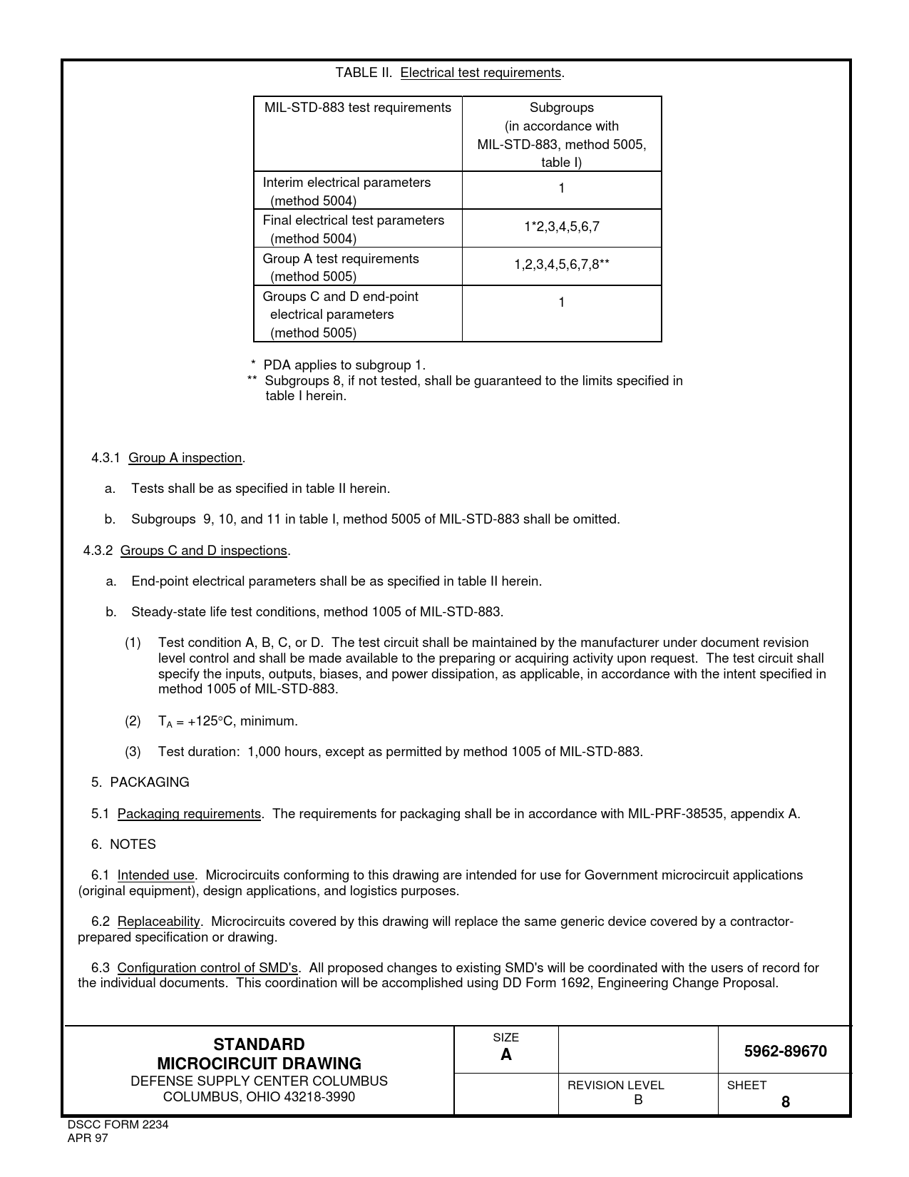 TABLE II. Electrical test requirements. MIL-STD-883 test requirements Subgroups (in accordance with MIL-STD-883, method 5005, table I) Interim electrical parameters 1 (method 5004) Final electrical test parameters 1*2,3,4,5,6,7 (method 5004) Group A test requirements 1,2,3,4,5,6,7,8** (method 5005) Groups C and D end-point 1 electrical parameters (method 5005) * PDA applies to subgroup 1. ** Subgroups 8, if not tested, shall be guaranteed to the limits specified in table I herein. 4.3.1 Group A inspection. a. Tests shall be as specified in table II herein. b. Subgroups 9, 10, and 11 in table I, method 5005 of MIL-STD-883 shall be omitted. 4.3.2 Groups C and D inspections. a. End-point electrical parameters shall be as specified in table II herein. b. Steady-state life test conditions, method 1005 of MIL-STD-883. (1) Test condition A, B, C, or D. The test circuit shall be maintained by the manufacturer under document revision level control and shall be made available to the preparing or acquiring activity upon request. The test circuit shall specify the inputs, outputs, biases, and power dissipation, as applicable, in accordance with the intent specified in method 1005 of MIL-STD-883. (2) TA = +125°C, minimum. (3) Test duration: 1,000 hours, except as permitted by method 1005 of MIL-STD-883. 5. PACKAGING 5.1 Packaging requirements. The requirements for packaging shall be in accordance with MIL-PRF-38535, appendix A. 6. NOTES 6.1 Intended use. Microcircuits conforming to this drawing are intended for use for Government microcircuit applications (original equipment), design applications, and logistics purposes. 6.2 Replaceability. Microcircuits covered by this drawing will replace the same generic device covered by a contractor- prepared specification or drawing. 6.3 Configuration control of SMD's. All proposed changes to existing SMD's will be coordinated with the users of record for the individual documents. This coordination will be accomplished using DD Form 1692, Engineering Change Proposal.