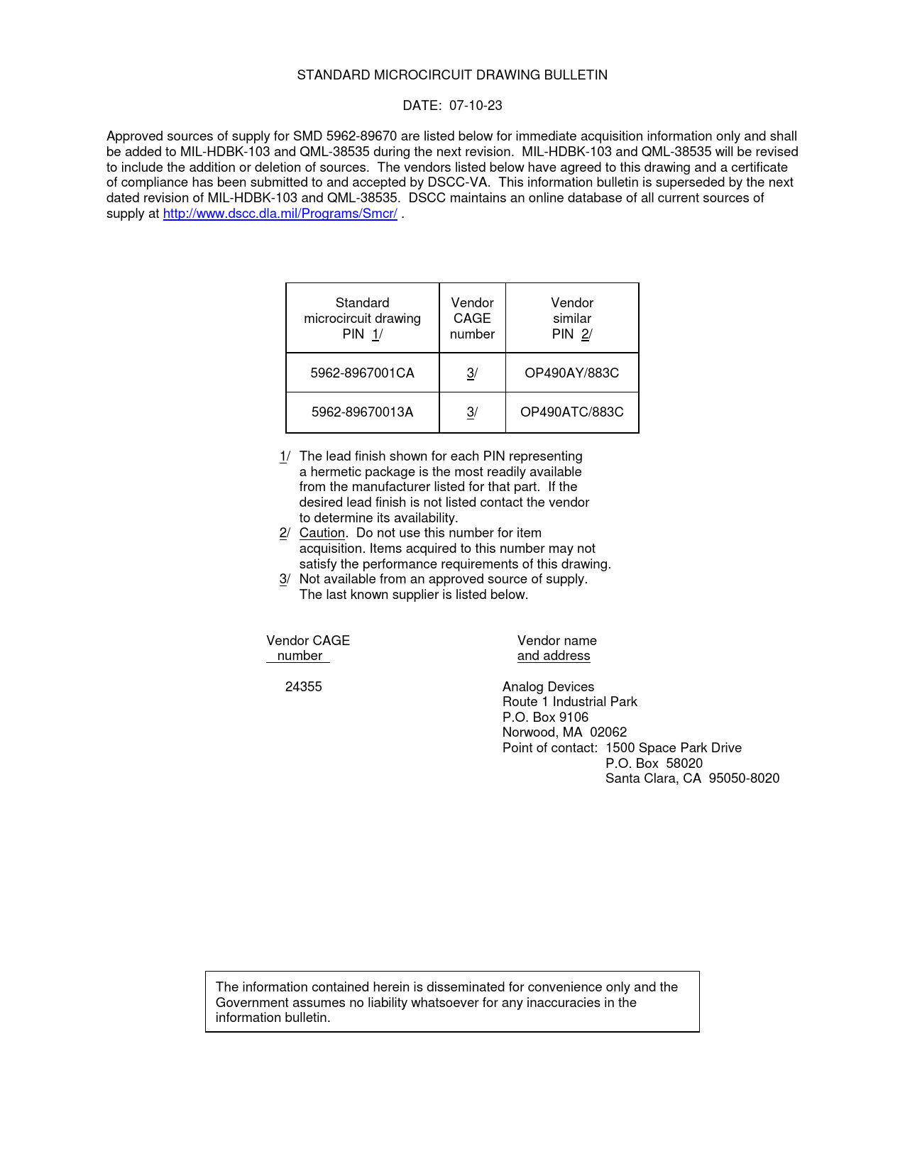 STANDARD MICROCIRCUIT DRAWING BULLETIN DATE: 07-10-23 Approved sources of supply for SMD 5962-89670 are listed below for immediate acquisition information only and shall be added to MIL-HDBK-103 and QML-38535 during the next revision. MIL-HDBK-103 and QML-38535 will be revised to include the addition or deletion of sources. The vendors listed below have agreed to this drawing and a certificate of compliance has been submitted to and accepted by DSCC-VA. This information bulletin is superseded by the next dated revision of MIL-HDBK-103 and QML-38535. DSCC maintains an online database of all current sources of supply at http://www.dscc.dla.mil/Programs/Smcr/ . Standard Vendor Vendor microcircuit drawing CAGE similar PIN 1/ number PIN 2/ 5962-8967001CA 3/ OP490AY/883C 5962-89670013A 3/ OP490ATC/883C 1/ The lead finish shown for each PIN representing a hermetic package is the most readily available from the manufacturer listed for that part. If the desired lead finish is not listed contact the vendor to determine its availability. 2/ Caution. Do not use this number for item acquisition. Items acquired to this number may not satisfy the performance requirements of this drawing. 3/ Not available from an approved source of supply. The last known supplier is listed below. Vendor CAGE Vendor name number and address 24355 Analog Devices Route 1 Industrial Park P.O. Box 9106 Norwood, MA 02062 Point of contact: 1500 Space Park Drive P.O. Box 58020 Santa Clara, CA 95050-8020 The information contained herein is disseminated for convenience only and the Government assumes no liability whatsoever for any inaccuracies in the information bulletin.