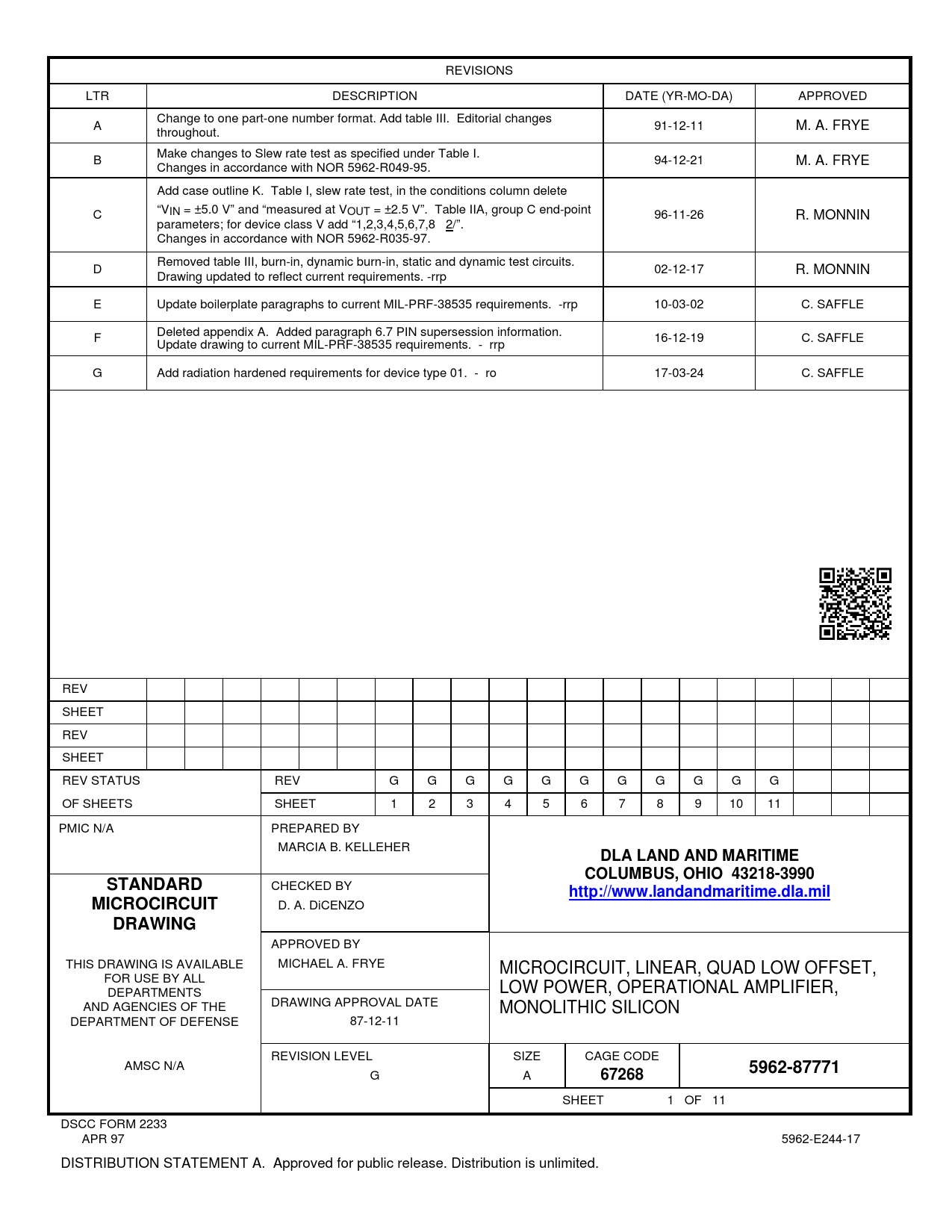 APPROVED BY THIS DRAWING IS AVAILABLE MICHAEL A. FRYE MICROCIRCUIT, LINEAR, QUAD LOW OFFSET, FOR USE BY ALL DEPARTMENTS LOW POWER, OPERATIONAL AMPLIFIER, AND AGENCIES OF THE DRAWING APPROVAL DATE MONOLITHIC SILICON DEPARTMENT OF DEFENSE 87-12-11 REVISION LEVEL SIZE CAGE CODE AMSC N/A