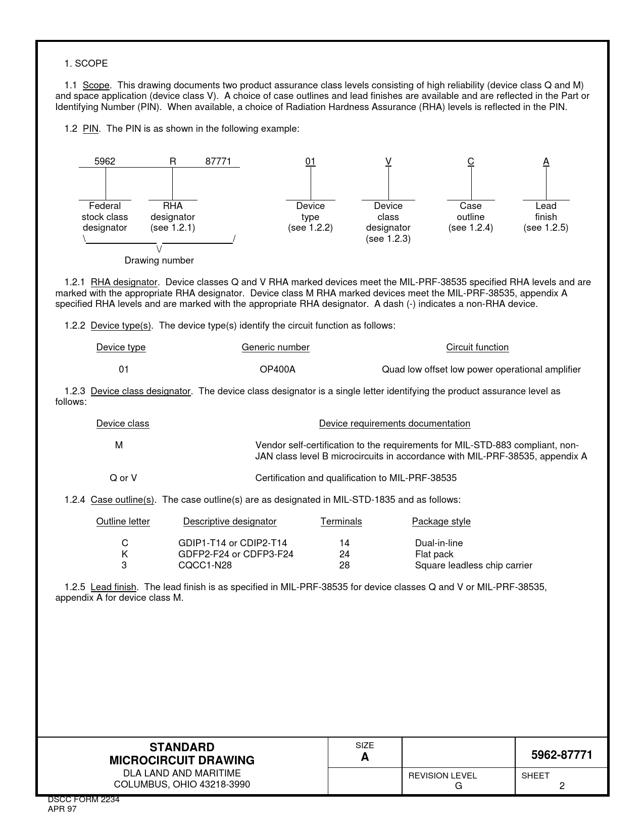 1. SCOPE 1.1 Scope. This drawing documents two product assurance class levels consisting of high reliability (device class Q and M) and space application (device class V). A choice of case outlines and lead finishes are available and are reflected in the Part or Identifying Number (PIN). When available, a choice of Radiation Hardness Assurance (RHA) levels is reflected in the PIN. 1.2 PIN. The PIN is as shown in the following example: 5962 R 87771 01 V C A Federal RHA Device Device Case Lead stock class designator type class outline finish designator (see 1.2.1) (see 1.2.2) designator (see 1.2.4) (see 1.2.5) \ / (see 1.2.3) \/ Drawing number 1.2.1 RHA designator. Device classes Q and V RHA marked devices meet the MIL-PRF-38535 specified RHA levels and are marked with the appropriate RHA designator. Device class M RHA marked devices meet the MIL-PRF-38535, appendix A specified RHA levels and are marked with the appropriate RHA designator. A dash (-) indicates a non-RHA device. 1.2.2 Device type(s). The device type(s) identify the circuit function as follows: Device type Generic number Circuit function 01 OP400A Quad low offset low power operational amplifier 1.2.3 Device class designator. The device class designator is a single letter identifying the product assurance level as follows: Device class Device requirements documentation M Vendor self-certification to the requirements for MIL-STD-883 compliant, non- JAN class level B microcircuits in accordance with MIL-PRF-38535, appendix A Q or V Certification and qualification to MIL-PRF-38535 1.2.4 Case outline(s). The case outline(s) are as designated in MIL-STD-1835 and as follows: Outline letter Descriptive designator Terminals Package style C GDIP1-T14 or CDIP2-T14 14 Dual-in-line K GDFP2-F24 or CDFP3-F24 24 Flat pack 3 CQCC1-N28 28 Square leadless chip carrier 1.2.5 Lead finish. The lead finish is as specified in MIL-PRF-38535 for device classes Q and V or MIL-PRF-38535, appendix A for device class M.