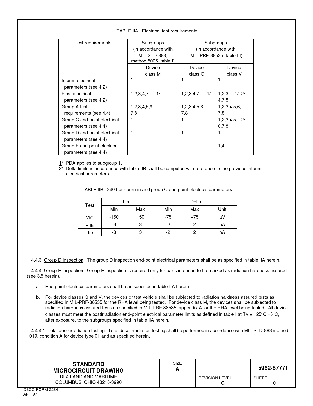 TABLE IIA. Electrical test requirements. Test requirements Subgroups Subgroups (in accordance with (in accordance with MIL-STD-883, MIL-PRF-38535, table III) method 5005, table I) Device Device Device class M class Q class V Interim electrical 1 1 1 parameters (see 4.2) Final electrical 1,2,3,4,7 1/ 1,2,3,4,7 1/ 1,2,3, 1/ 2/ parameters (see 4.2) 4,7,8 Group A test 1,2,3,4,5,6, 1,2,3,4,5,6, 1,2,3,4,5,6, requirements (see 4.4) 7,8 7,8 7,8 Group C end-point electrical 1 1 1,2,3,4,5, 2/ parameters (see 4.4) 6,7,8 Group D end-point electrical 1 1 1 parameters (see 4.4) Group E end-point electrical --- --- 1,4 parameters (see 4.4) 1/ PDA applies to subgroup 1. 2/ Delta limits in accordance with table IIB shall be computed with reference to the previous interim electrical parameters. TABLE IIB. 240 hour burn-in and group C end-point electrical parameters. Limit Delta Test Min Max Min Max Unit VIO -150 150 -75 +75 V +IIB -3 3 -2 2 nA -IIB -3 3 -2 2 nA 4.4.3 Group D inspection. The group D inspection end-point electrical parameters shall be as specified in table IIA herein. 4.4.4 Group E inspection. Group E inspection is required only for parts intended to be marked as radiation hardness assured (see 3.5 herein). a. End-point electrical parameters shall be as specified in table IIA herein. b. For device classes Q and V, the devices or test vehicle shall be subjected to radiation hardness assured tests as specified in MIL-PRF-38535 for the RHA level being tested. For device class M, the devices shall be subjected to radiation hardness assured tests as specified in MIL-PRF-38535, appendix A for the RHA level being tested. All device classes must meet the postirradiation end-point electrical parameter limits as defined in table I at TA = +25C 5C, after exposure, to the subgroups specified in table IIA herein. 4.4.4.1 Total dose irradiation testing. Total dose irradiation testing shall be performed in accordance with MIL-STD-883 method 1019, condition A for device type 01 and as specified herein. STANDARD SIZE 5962-87771MICROCIRCUIT DRAWINGA DLA LAND AND MARITIME REVISION LEVEL SHEET COLUMBUS, OHIO 43218-3990 G 10 DSCC FORM 2234 APR 97