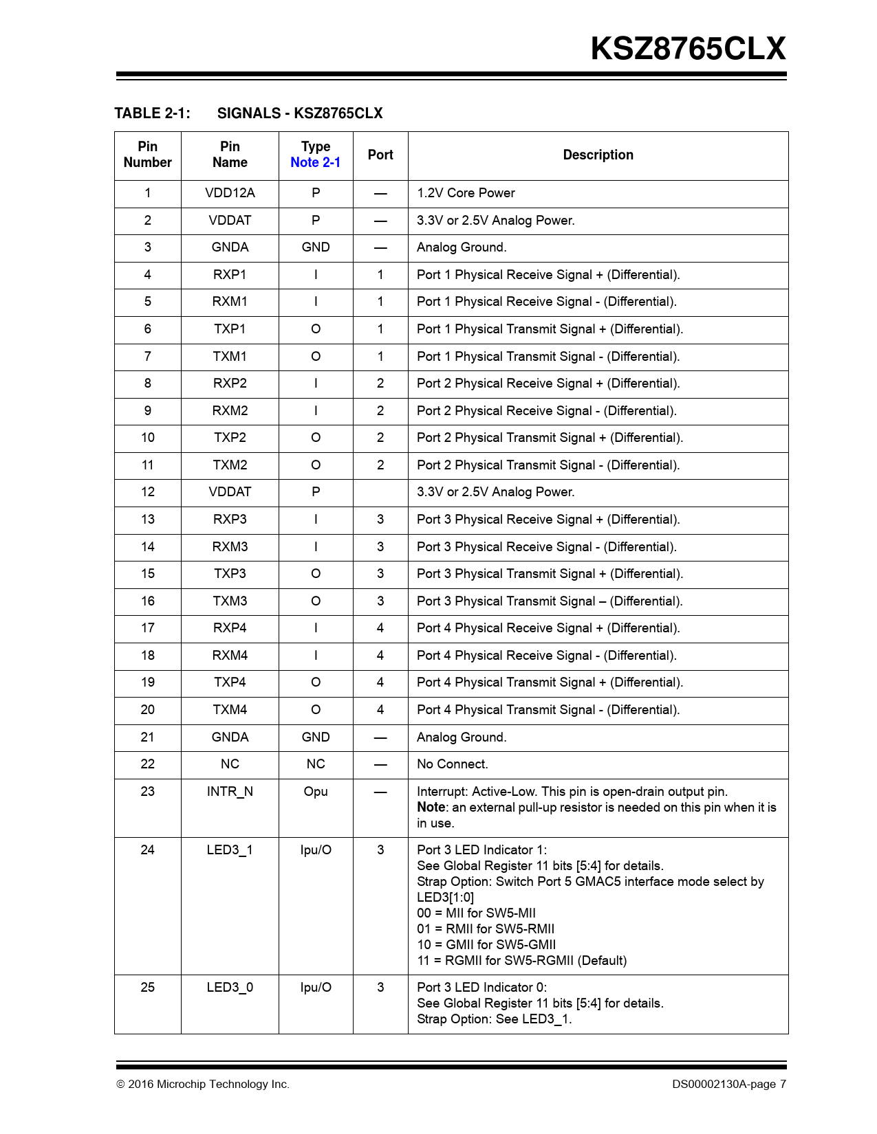 : an external pull-up resistor is needed on this pin when it is in use. 24 LED3_1 Ipu/O 3 Port 3 LED Indicator 1: See Global Register 11 bits [5:4] for details. Strap Option: Switch Port 5 GMAC5 interface mode select by LED3[1:0] 00 = MII for SW5-MII 01 = RMII for SW5-RMII 10 = GMII for SW5-GMII 11 = RGMII for SW5-RGMII (Default) 25 LED3_0 Ipu/O 3 Port 3 LED Indicator 0: See Global Register 11 bits [5:4] for details. Strap Option: See LED3_1.  2016 Microchip Technology Inc. DS00002130A-page 7 Document Outline 1.0 Introduction 1.1 General Description 2.0 Pin Description and Configuration 3.0 Functional Description 3.1 Physical Layer (PHY) 3.2 Media Access Controller (MAC) Operation 3.3 Switch Core 3.4 Power and Power Management 3.5 Interfaces 3.6 Advanced Functionality 4.0 Device Registers 4.1 Register Map 4.2 Port Registers 4.3 Advanced Control Registers 4.4 Static MAC Address Table 4.5 VLAN Table 4.6 Dynamic MAC Address Table 4.7 PME Indirect Registers 4.8 ACL Rule Table and ACL Indirect Registers 4.9 EEE Indirect Registers 4.10 Management Information Base (MIB) Counters 4.11 MIIM Registers 5.0 Operational Characteristics 5.1 Absolute Maximum Ratings* 5.2 Operating Ratings** 6.0 Electrical Characteristics 7.0 Timing Diagrams 8.0 Reset Circuit 9.0 Selection of Isolation Transformer 10.0 Selection of Reference Crystal 11.0 Package Outlines