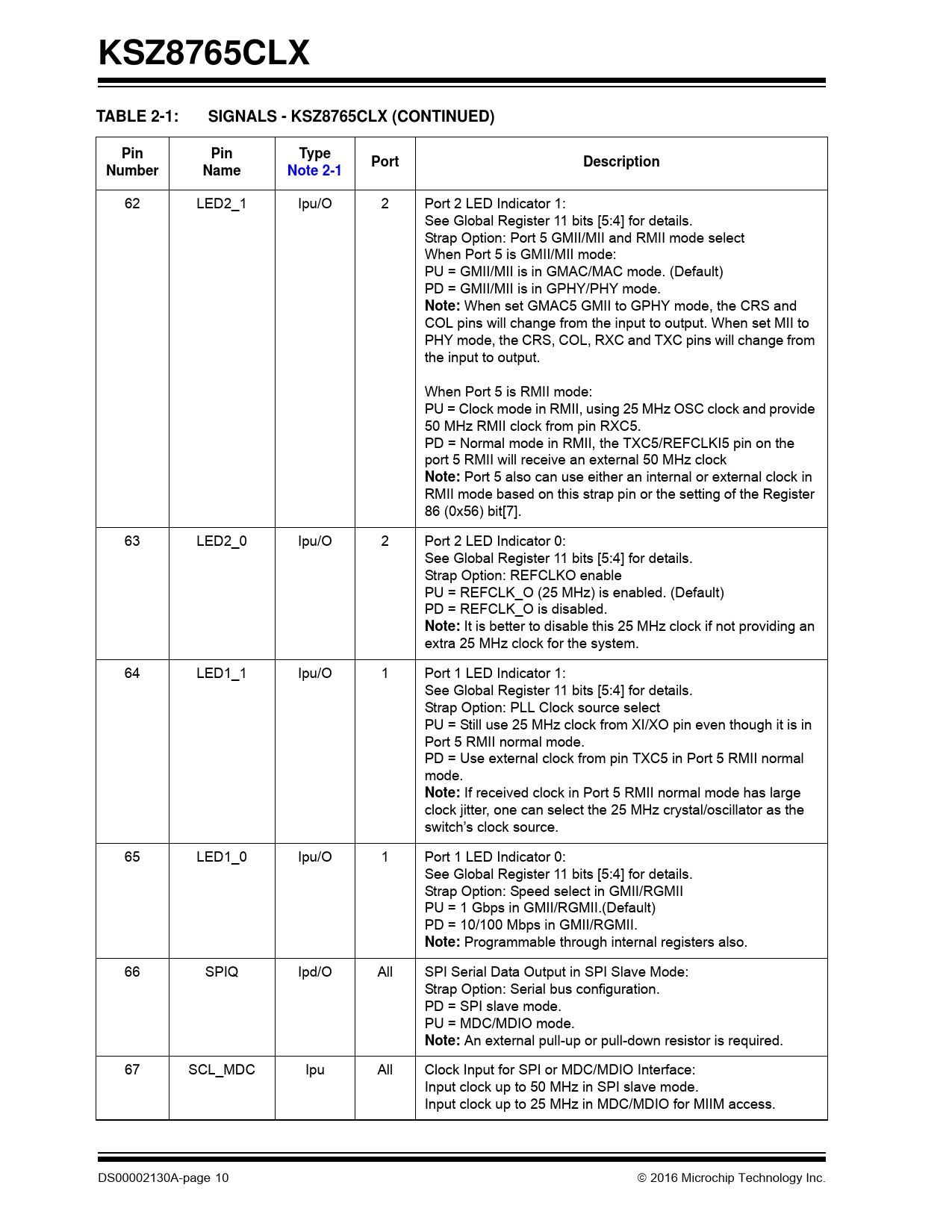 An external pull-up or pull-down resistor is required. 67 SCL_MDC Ipu All Clock Input for SPI or MDC/MDIO Interface: Input clock up to 50 MHz in SPI slave mode. Input clock up to 25 MHz in MDC/MDIO for MIIM access. DS00002130A-page 10  2016 Microchip Technology Inc. Document Outline 1.0 Introduction 1.1 General Description 2.0 Pin Description and Configuration 3.0 Functional Description 3.1 Physical Layer (PHY) 3.2 Media Access Controller (MAC) Operation 3.3 Switch Core 3.4 Power and Power Management 3.5 Interfaces 3.6 Advanced Functionality 4.0 Device Registers 4.1 Register Map 4.2 Port Registers 4.3 Advanced Control Registers 4.4 Static MAC Address Table 4.5 VLAN Table 4.6 Dynamic MAC Address Table 4.7 PME Indirect Registers 4.8 ACL Rule Table and ACL Indirect Registers 4.9 EEE Indirect Registers 4.10 Management Information Base (MIB) Counters 4.11 MIIM Registers 5.0 Operational Characteristics 5.1 Absolute Maximum Ratings* 5.2 Operating Ratings** 6.0 Electrical Characteristics 7.0 Timing Diagrams 8.0 Reset Circuit 9.0 Selection of Isolation Transformer 10.0 Selection of Reference Crystal 11.0 Package Outlines