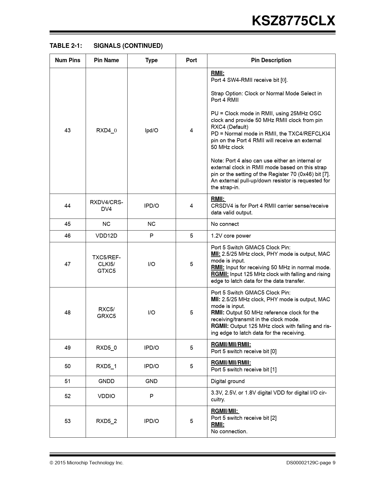 Port 5 switch receive bit [1] 51 GNDD GND 52 VDDIO P 53 RXD5_2  2015 Microchip Technology Inc. IPD/O Digital ground