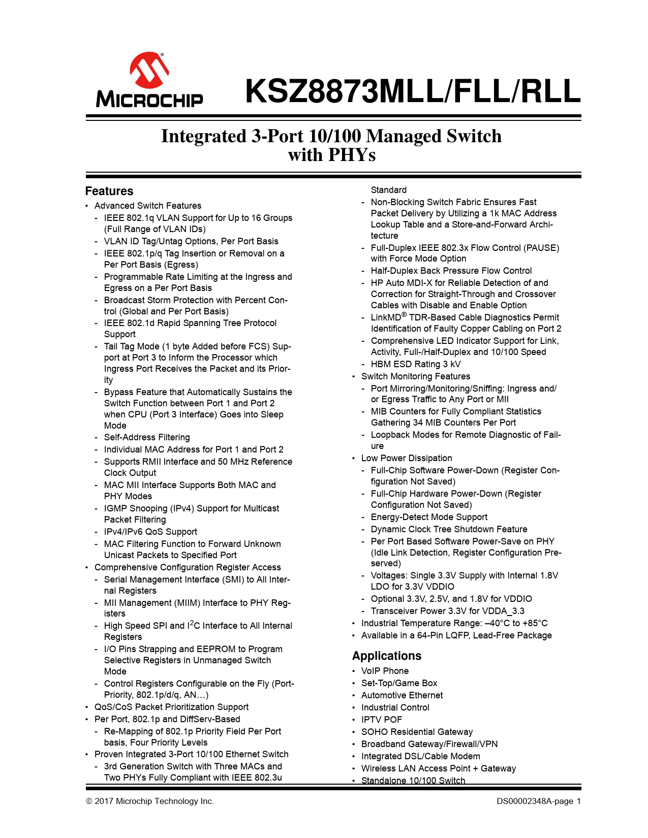 KSZ8873MLL/FLL/RLLIntegrated 3-Port 10/100 Managed Switchwith PHYsFeatures Standard • Advanced Switch Features - Non-Blocking Switch Fabric Ensures Fast - IEEE 802.1q VLAN Support for Up to 16 Groups Packet Delivery by Utilizing a 1k MAC Address (Full Range of VLAN IDs) Lookup Table and a Store-and-Forward Archi- tecture - VLAN ID Tag/Untag Options, Per Port Basis - Full-Duplex IEEE 802.3x Flow Control (PAUSE) - IEEE 802.1p/q Tag Insertion or Removal on a with Force Mode Option Per Port Basis (Egress) - Half-Duplex Back Pressure Flow Control - Programmable Rate Limiting at the Ingress and Egress on a Per Port Basis - HP Auto MDI-X for Reliable Detection of and Correction for Straight-Through and Crossover - Broadcast Storm Protection with Percent Con- Cables with Disable and Enable Option trol (Global and Per Port Basis) - LinkMD® TDR-Based Cable Diagnostics Permit - IEEE 802.1d Rapid Spanning Tree Protocol Identification of Faulty Copper Cabling on Port 2 Support - Comprehensive LED Indicator Support for Link, - Tail Tag Mode (1 byte Added before FCS) Sup- Activity, Full-/Half-Duplex and 10/100 Speed port at Port 3 to Inform the Processor which Ingress Port Receives the Packet and its Prior- - HBM ESD Rating 3 kV ity • Switch Monitoring Features - Bypass Feature that Automatically Sustains the - Port Mirroring/Monitoring/Sniffing: Ingress and/ Switch Function between Port 1 and Port 2 or Egress Traffic to Any Port or MII when CPU (Port 3 Interface) Goes into Sleep - MIB Counters for Fully Compliant Statistics Mode Gathering 34 MIB Counters Per Port - Self-Address Filtering - Loopback Modes for Remote Diagnostic of Fail- - Individual MAC Address for Port 1 and Port 2 ure - Supports RMII Interface and 50 MHz Reference • Low Power Dissipation Clock Output - Full-Chip Software Power-Down (Register Con- - MAC MII Interface Supports Both MAC and figuration Not Saved) PHY Modes - Full-Chip Hardware Power-Down (Register - IGMP Snooping (IPv4) Support for Multicast Configuration Not Saved) Packet Filtering - Energy-Detect Mode Support - IPv4/IPv6 QoS Support - Dynamic Clock Tree Shutdown Feature - MAC Filtering Function to Forward Unknown - Per Port Based Software Power-Save on PHY Unicast Packets to Specified Port (Idle Link Detection, Register Configuration Pre- • Comprehensive Configuration Register Access served) - Serial Management Interface (SMI) to All Inter- - Voltages: Single 3.3V Supply with Internal 1.8V nal Registers LDO for 3.3V VDDIO - MII Management (MIIM) Interface to PHY Reg- - Optional 3.3V, 2.5V, and 1.8V for VDDIO isters - Transceiver Power 3.3V for VDDA_3.3 - High Speed SPI and I2C Interface to All Internal • Industrial Temperature Range: –40°C to +85°C Registers • Available in a 64-Pin LQFP, Lead-Free Package - I/O Pins Strapping and EEPROM to Program Selective Registers in Unmanaged Switch Applications Mode • VoIP Phone - Control Registers Configurable on the Fly (Port- • Set-Top/Game Box Priority, 802.1p/d/q, AN…) • Automotive Ethernet • QoS/CoS Packet Prioritization Support • Industrial Control • Per Port, 802.1p and DiffServ-Based • IPTV POF - Re-Mapping of 802.1p Priority Field Per Port • SOHO Residential Gateway basis, Four Priority Levels • Broadband Gateway/Firewall/VPN • Proven Integrated 3-Port 10/100 Ethernet Switch • Integrated DSL/Cable Modem - 3rd Generation Switch with Three MACs and • Wireless LAN Access Point + Gateway Two PHYs Fully Compliant with IEEE 802.3u • Standalone 10/100 Switch 2017 Microchip Technology Inc. DS00002348A-page 1 Document Outline 1.0 Introduction 1.1 General Description 2.0 Pin Description and Configuration 3.0 Functional Description 3.1 Physical Layer Transceiver 3.2 Power Management 3.3 MAC and Switch 3.4 Advanced Switch Functions 3.5 Spanning Tree Support 3.6 Rapid Spanning Tree Support 3.7 Tail Tagging Mode 3.8 IGMP Support 3.9 Port Mirroring Support 3.10 Rate Limiting Support 3.11 Unicast MAC Address Filtering 3.12 Configuration Interface 3.13 Loopback Support 4.0 Register Descriptions 4.1 MII Management (MIIM) Registers 4.2 Register Descriptions 4.3 Memory Map (8-Bit Registers) 4.4 Register Descriptions 4.5 Advanced Control Registers (Registers 96-198) 4.6 Static MAC Address Table 4.7 VLAN Table 4.8 Dynamic MAC Address Table 4.9 Management Information Base (MIB) Counters 5.0 Operational Characteristics 5.1 Absolute Maximum Ratings* 5.2 Operating Ratings** 6.0 Electrical Characteristics 7.0 Timing Specifications 7.1 EEPROM Timing 7.2 MAC Mode MII Timing 7.3 PHY Mode MII Timing 7.4 RMII Timing 7.5 I2C Slave Mode Timing 7.6 SPI Input Timing 7.7 SPI Output Timing 7.8 Auto-Negotiation Timing 7.9 MDC/MDIO Timing 7.10 Reset Timing 8.0 Reset Circuit 9.0 Selection of Isolation Transformers 10.0 Package Outline Appendix A: Data Sheet Revision History Product Identification System Worldwide Sales and Service