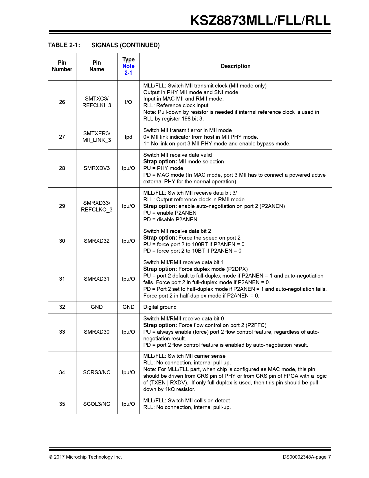 KSZ8873MLL/FLL/RLLTABLE 2-1:SIGNALS (CONTINUED)TypePinPinNoteDescriptionNumberName2-1 MLL/FLL: Switch MII transmit clock (MII mode only) Output in PHY MII mode and SNI mode SMTXC3/ Input in MAC MII and RMII mode. 26 I/O REFCLKI_3 RLL: Reference clock input Note: Pull-down by resistor is needed if internal reference clock is used in RLL by register 198 bit 3. Switch MII transmit error in MII mode SMTXER3/ 27 Ipd 0= MII link indicator from host in MII PHY mode. MII_LINK_3 1= No link on port 3 MII PHY mode and enable bypass mode. Switch MII receive data valid Strap option: MII mode selection 28 SMRXDV3 Ipu/O PU = PHY mode. PD = MAC mode (In MAC mode, port 3 MII has to connect a powered active external PHY for the normal operation) MLL/FLL: Switch MII receive data bit 3/ RLL: Output reference clock in RMII mode. SMRXD33/ 29 Ipu/O REFCLKO_3 Strap option: enable auto-negotiation on port 2 (P2ANEN) PU = enable P2ANEN PD = disable P2ANEN Switch MII receive data bit 2 30 SMRXD32 Ipu/O Strap option: Force the speed on port 2 PU = force port 2 to 100BT if P2ANEN = 0 PD = force port 2 to 10BT if P2ANEN = 0 Switch MII/RMII receive data bit 1 Strap option: Force duplex mode (P2DPX) PU = port 2 default to full-duplex mode if P2ANEN = 1 and auto-negotiation 31 SMRXD31 Ipu/O fails. Force port 2 in full-duplex mode if P2ANEN = 0. PD = Port 2 set to half-duplex mode if P2ANEN = 1 and auto-negotiation fails. Force port 2 in half-duplex mode if P2ANEN = 0. 32 GND GND Digital ground Switch MII/RMII receive data bit 0 Strap option: Force flow control on port 2 (P2FFC) 33 SMRXD30 Ipu/O PU = always enable (force) port 2 flow control feature, regardless of auto- negotiation result. PD = port 2 flow control feature is enabled by auto-negotiation result. MLL/FLL: Switch MII carrier sense RLL: No connection, internal pull-up. Note: For MLL/FLL part, when chip is configured as MAC mode, this pin 34 SCRS3/NC Ipu/O should be driven from CRS pin of PHY or from CRS pin of FPGA with a logic of (TXEN | RXDV). If only full-duplex is used, then this pin should be pull- down by 1kΩ resistor. MLL/FLL: Switch MII collision detect 35 SCOL3/NC Ipu/O RLL: No connection, internal pull-up. 2017 Microchip Technology Inc. DS00002348A-page 7 Document Outline 1.0 Introduction 1.1 General Description 2.0 Pin Description and Configuration 3.0 Functional Description 3.1 Physical Layer Transceiver 3.2 Power Management 3.3 MAC and Switch 3.4 Advanced Switch Functions 3.5 Spanning Tree Support 3.6 Rapid Spanning Tree Support 3.7 Tail Tagging Mode 3.8 IGMP Support 3.9 Port Mirroring Support 3.10 Rate Limiting Support 3.11 Unicast MAC Address Filtering 3.12 Configuration Interface 3.13 Loopback Support 4.0 Register Descriptions 4.1 MII Management (MIIM) Registers 4.2 Register Descriptions 4.3 Memory Map (8-Bit Registers) 4.4 Register Descriptions 4.5 Advanced Control Registers (Registers 96-198) 4.6 Static MAC Address Table 4.7 VLAN Table 4.8 Dynamic MAC Address Table 4.9 Management Information Base (MIB) Counters 5.0 Operational Characteristics 5.1 Absolute Maximum Ratings* 5.2 Operating Ratings** 6.0 Electrical Characteristics 7.0 Timing Specifications 7.1 EEPROM Timing 7.2 MAC Mode MII Timing 7.3 PHY Mode MII Timing 7.4 RMII Timing 7.5 I2C Slave Mode Timing 7.6 SPI Input Timing 7.7 SPI Output Timing 7.8 Auto-Negotiation Timing 7.9 MDC/MDIO Timing 7.10 Reset Timing 8.0 Reset Circuit 9.0 Selection of Isolation Transformers 10.0 Package Outline Appendix A: Data Sheet Revision History Product Identification System Worldwide Sales and Service