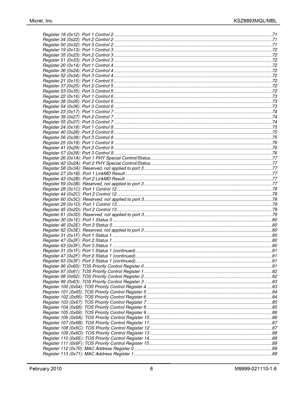 Micrel, Inc. KSZ8893MQL/MBL Register 18 (0x12): Port 1 Control 2 .71 Register 34 (0x22): Port 2 Control 2 .71 Register 50 (0x32): Port 3 Control 2 .71 Register 19 (0x13): Port 1 Control 3 .72 Register 35 (0x23): Port 2 Control 3 .72 Register 51 (0x33): Port 3 Control 3 .72 Register 20 (0x14): Port 1 Control 4 .72 Register 36 (0x24): Port 2 Control 4 .72 Register 52 (0x34): Port 3 Control 4 .72 Register 21 (0x15): Port 1 Control 5 .72 Register 37 (0x25): Port 2 Control 5 .72 Register 53 (0x35): Port 3 Control 5 .72 Register 22 (0x16): Port 1 Control 6 .73 Register 38 (0x26): Port 2 Control 6 .73 Register 54 (0x36): Port 3 Control 6 .73 Register 23 (0x17): Port 1 Control 7 .74 Register 39 (0x27): Port 2 Control 7 .74 Register 55 (0x37): Port 3 Control 7 .74 Register 24 (0x18): Port 1 Control 8 .75 Register 40 (0x28): Port 2 Control 8 .75 Register 56 (0x38): Port 3 Control 8 .75 Register 25 (0x19): Port 1 Control 9 .76 Register 41 (0x29): Port 2 Control 9 .76 Register 57 (0x39): Port 3 Control 9 .76 Register 26 (0x1A): Port 1 PHY Special Control/Status.77 Register 42 (0x2A): Port 2 PHY Special Control/Status.77 Register 58 (0x3A): Reserved, not applied to port 3 .77 Register 27 (0x1B): Port 1 LinkMD Result .77 Register 43 (0x2B): Port 2 LinkMD Result .77 Register 59 (0x3B): Reserved, not applied to port 3 .77 Register 28 (0x1C): Port 1 Control 12.78 Register 44 (0x2C): Port 2 Control 12.78 Register 60 (0x3C): Reserved, not applied to port 3.78 Register 29 (0x1D): Port 1 Control 13.79 Register 45 (0x2D): Port 2 Control 13.79 Register 61 (0x3D): Reserved, not applied to port 3.79 Register 30 (0x1E): Port 1 Status 0 .80 Register 46 (0x2E): Port 2 Status 0 .80 Register 62 (0x3E): Reserved, not applied to port 3 .80 Register 31 (0x1F): Port 1 Status 1 .80 Register 47 (0x2F): Port 2 Status 1 .80 Register 63 (0x3F): Port 3 Status 1 .80 Register 31 (0x1F): Port 1 Status 1 (continued).81 Register 47 (0x2F): Port 2 Status 1 (continued).81 Register 63 (0x3F): Port 3 Status 1 (continued).81 Register 96 (0x60): TOS Priority Control Register 0 .81 Register 97 (0x61): TOS Priority Control Register 1 .82 Register 98 (0x62): TOS Priority Control Register 2 .82 Register 99 (0x63): TOS Priority Control Register 3 .83 Register 100 (0x64): TOS Priority Control Register 4 .83 Register 101 (0x65): TOS Priority Control Register 5 .84 Register 102 (0x66): TOS Priority Control Register 6 .84 Register 103 (0x67): TOS Priority Control Register 7 .85 Register 104 (0x68): TOS Priority Control Register 8 .85 Register 105 (0x69): TOS Priority Control Register 9 .86 Register 106 (0x6A): TOS Priority Control Register 10.86 Register 107 (0x6B): TOS Priority Control Register 11.87 Register 108 (0x6C): TOS Priority Control Register 12 .87 Register 109 (0x6D): TOS Priority Control Register 13 .88 Register 110 (0x6E): TOS Priority Control Register 14.88 Register 111 (0x6F): TOS Priority Control Register 15.89 Register 112 (0x70): MAC Address Register 0 .89 Register 113 (0x71): MAC Address Register 1 .89 February 2010 6 M9999-021110-1.6