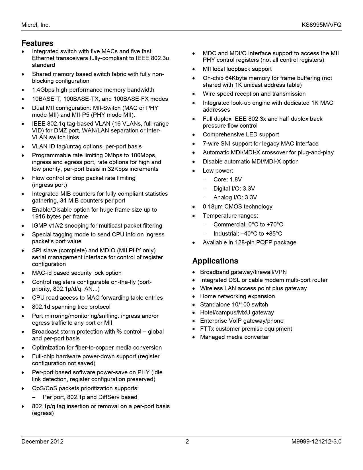Micrel, Inc. KS8995MA/FQ Features • Integrated switch with five MACs and five fast • MDC and MDI/O interface support to access the MII Ethernet transceivers fully-compliant to IEEE 802.3u PHY control registers (not all control registers) standard • MII local loopback support • Shared memory based switch fabric with fully non- blocking configuration • On-chip 64Kbyte memory for frame buffering (not shared with 1K unicast address table) • 1.4Gbps high-performance memory bandwidth • Wire-speed reception and transmission • 10BASE-T, 100BASE-TX, and 100BASE-FX modes • Integrated look-up engine with dedicated 1K MAC • Dual MII configuration: MII-Switch (MAC or PHY addresses mode MII) and MII-P5 (PHY mode MII). • Full duplex IEEE 802.3x and half-duplex back • IEEE 802.1q tag-based VLAN (16 VLANs, full-range pressure flow control VID) for DMZ port, WAN/LAN separation or inter- VLAN switch links • Comprehensive LED support • VLAN ID tag/untag options, per-port basis • 7-wire SNI support for legacy MAC interface • Programmable rate limiting 0Mbps to 100Mbps, • Automatic MDI/MDI-X crossover for plug-and-play ingress and egress port, rate options for high and • Disable automatic MDI/MDI-X option low priority, per-port basis in 32Kbps increments • Low power: • Flow control or drop packet rate limiting − Core: 1.8V (ingress port) − Digital I/O: 3.3V • Integrated MIB counters for fully-compliant statistics − gathering, 34 MIB counters per port Analog I/O: 3.3V • • Enable/Disable option for huge frame size up to 0.18µm CMOS technology 1916 bytes per frame • Temperature ranges: • IGMP v1/v2 snooping for multicast packet filtering − Commercial: 0°C to +70°C • Special tagging mode to send CPU info on ingress − Industrial: –40°C to +85°C packet’s port value • Available in 128-pin PQFP package • SPI slave (complete) and MDIO (MII PHY only) serial management interface for control of register configuration Applications • MAC-id based security lock option • Broadband gateway/firewall/VPN • Control registers configurable on-the-fly (port- • Integrated DSL or cable modem multi-port router priority, 802.1p/d/q, AN...) • Wireless LAN access point plus gateway • CPU read access to MAC forwarding table entries • Home networking expansion • 802.1d spanning tree protocol • Standalone 10/100 switch • • Port mirroring/monitoring/sniffing: ingress and/or Hotel/campus/MxU gateway egress traffic to any port or MII • Enterprise VoIP gateway/phone • Broadcast storm protection with % control – global • FTTx customer premise equipment and per-port basis • Managed media converter • Optimization for fiber-to-copper media conversion • Full-chip hardware power-down support (register configuration not saved) • Per-port based software power-save on PHY (idle link detection, register configuration preserved) • QoS/CoS packets prioritization supports: − Per port, 802.1p and DiffServ based • 802.1p/q tag insertion or removal on a per-port basis (egress) December 2012 2 M9999-121212-3.0
