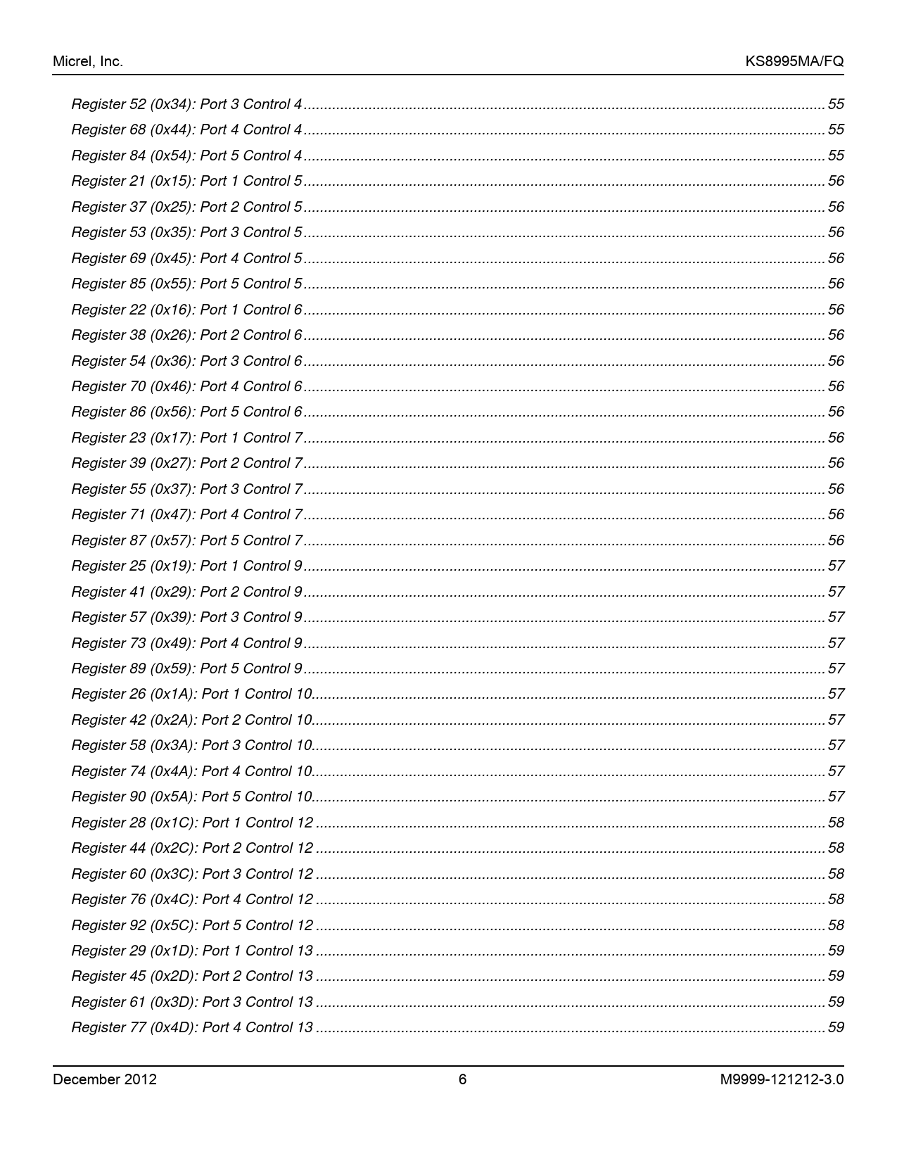 Micrel, Inc. KS8995MA/FQ Register 52 (0x34): Port 3 Control 4 ... 55 Register 68 (0x44): Port 4 Control 4 ... 55 Register 84 (0x54): Port 5 Control 4 ... 55 Register 21 (0x15): Port 1 Control 5 ... 56 Register 37 (0x25): Port 2 Control 5 ... 56 Register 53 (0x35): Port 3 Control 5 ... 56 Register 69 (0x45): Port 4 Control 5 ... 56 Register 85 (0x55): Port 5 Control 5 ... 56 Register 22 (0x16): Port 1 Control 6 ... 56 Register 38 (0x26): Port 2 Control 6 ... 56 Register 54 (0x36): Port 3 Control 6 ... 56 Register 70 (0x46): Port 4 Control 6 ... 56 Register 86 (0x56): Port 5 Control 6 ... 56 Register 23 (0x17): Port 1 Control 7 ... 56 Register 39 (0x27): Port 2 Control 7 ... 56 Register 55 (0x37): Port 3 Control 7 ... 56 Register 71 (0x47): Port 4 Control 7 ... 56 Register 87 (0x57): Port 5 Control 7 ... 56 Register 25 (0x19): Port 1 Control 9 ... 57 Register 41 (0x29): Port 2 Control 9 ... 57 Register 57 (0x39): Port 3 Control 9 ... 57 Register 73 (0x49): Port 4 Control 9 ... 57 Register 89 (0x59): Port 5 Control 9 ... 57 Register 26 (0x1A): Port 1 Control 10... 57 Register 42 (0x2A): Port 2 Control 10... 57 Register 58 (0x3A): Port 3 Control 10... 57 Register 74 (0x4A): Port 4 Control 10... 57 Register 90 (0x5A): Port 5 Control 10... 57 Register 28 (0x1C): Port 1 Control 12 .. 58 Register 44 (0x2C): Port 2 Control 12 .. 58 Register 60 (0x3C): Port 3 Control 12 .. 58 Register 76 (0x4C): Port 4 Control 12 .. 58 Register 92 (0x5C): Port 5 Control 12 .. 58 Register 29 (0x1D): Port 1 Control 13 .. 59 Register 45 (0x2D): Port 2 Control 13 .. 59 Register 61 (0x3D): Port 3 Control 13 .. 59 Register 77 (0x4D): Port 4 Control 13 .. 59 December 2012 6 M9999-121212-3.0