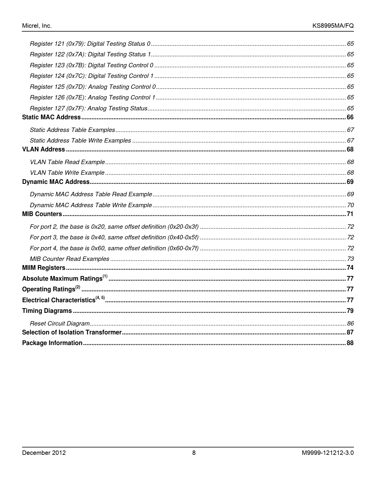 Micrel, Inc. KS8995MA/FQ Register 121 (0x79): Digital Testing Status 0 ... 65 Register 122 (0x7A): Digital Testing Status 1 ... 65 Register 123 (0x7B): Digital Testing Control 0 ... 65 Register 124 (0x7C): Digital Testing Control 1 ... 65 Register 125 (0x7D): Analog Testing Control 0 .. 65 Register 126 (0x7E): Analog Testing Control 1 .. 65 Register 127 (0x7F): Analog Testing Status ... 65 Static MAC Address .. 66 Static Address Table Examples .. 67 Static Address Table Write Examples .. 67 VLAN Address ... 68 VLAN Table Read Example .. 68 VLAN Table Write Example .. 68 Dynamic MAC Address ... 69 Dynamic MAC Address Table Read Example .. 69 Dynamic MAC Address Table Write Example .. 70 MIB Counters ... 71 For port 2, the base is 0x20, same offset definition (0x20-0x3f) .. 72 For port 3, the base is 0x40, same offset definition (0x40-0x5f) .. 72 For port 4, the base is 0x60, same offset definition (0x60-0x7f) .. 72 MIB Counter Read Examples ... 73 MIIM Registers ... 74Absolute Maximum Ratings(1) .. 77Operating Ratings(2) .. 77Electrical Characteristics(4, 5) .. 77Timing Diagrams ... 79 Reset Circuit Diagram ... 86 Selection of Isolation Transformer .. 87Package Information ... 88 December 2012 8 M9999-121212-3.0