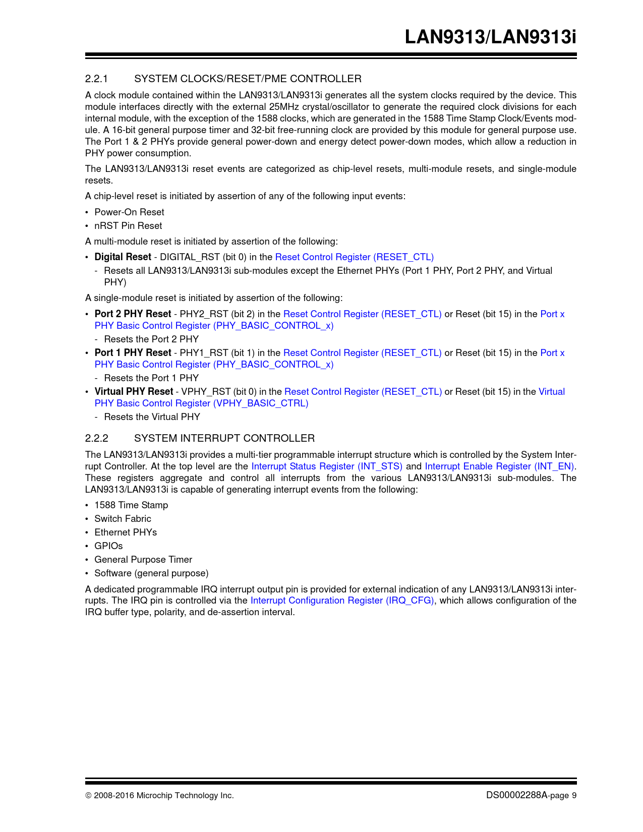 2.2.1 SYSTEM CLOCKS/RESET/PME CONTROLLER A clock module contained within the LAN9313/LAN9313i generates all the system clocks required by the device. This module interfaces directly with the external 25MHz crystal/oscillator to generate the required clock divisions for each internal module, with the exception of the 1588 clocks, which are generated in the 1588 Time Stamp Clock/Events mod- ule. A 16-bit general purpose timer and 32-bit free-running clock are provided by this module for general purpose use. The Port 1 & 2 PHYs provide general power-down and energy detect power-down modes, which allow a reduction in PHY power consumption. The LAN9313/LAN9313i reset events are categorized as chip-level resets, multi-module resets, and single-module resets. A chip-level reset is initiated by assertion of any of the following input events: • Power-On Reset • nRST Pin Reset A multi-module reset is initiated by assertion of the following: •