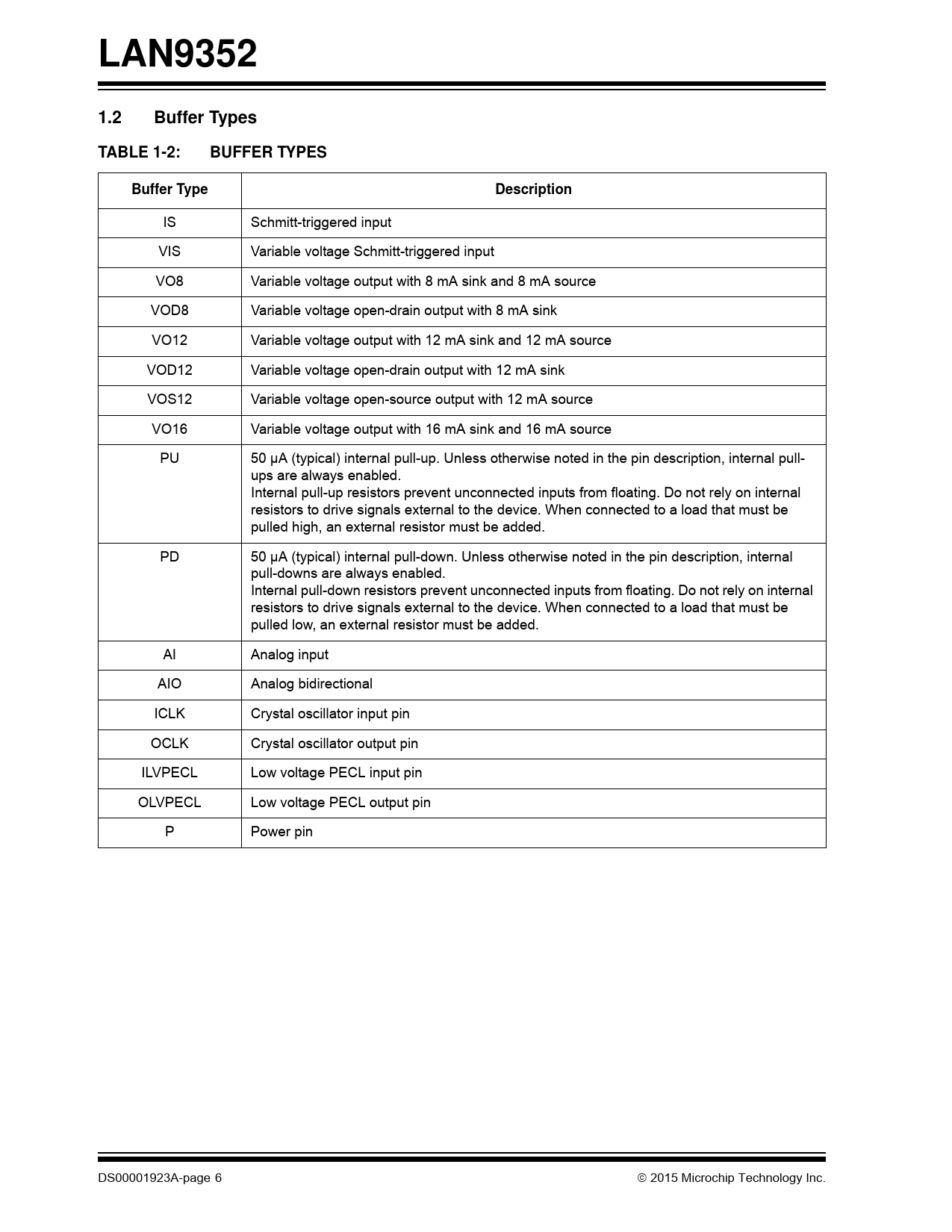 LAN9352. 1.2. Buffer Types. TABLE 1-2:. BUFFER TYPES. Buffer Type. Description