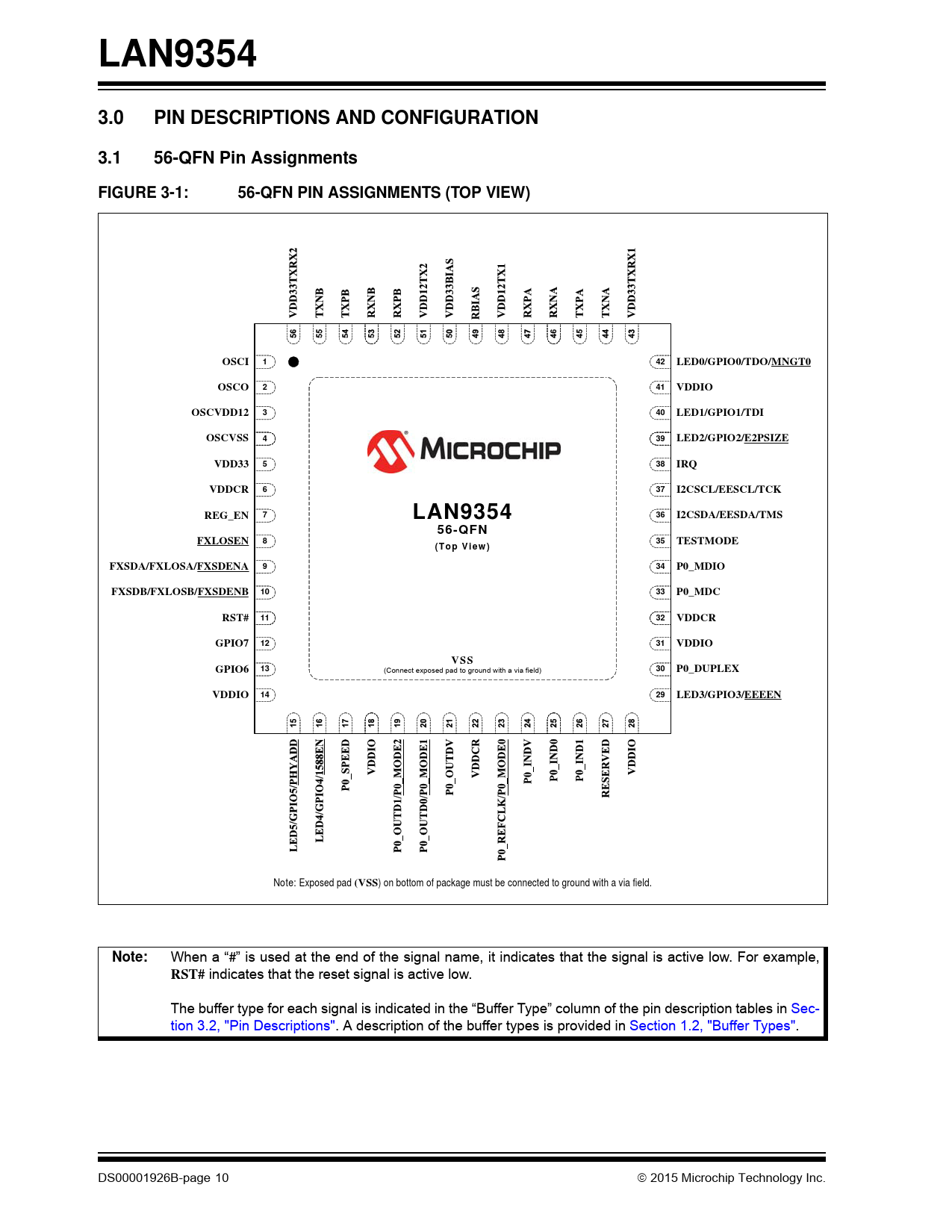 LAN9354. 3.0. PIN DESCRIPTIONS AND CONFIGURATION. 3.1. 56-QFN Pin Assignments. FIGURE 3-1:. 56-QFN PIN ASSIGNMENTS (TOP VIEW). OSCI