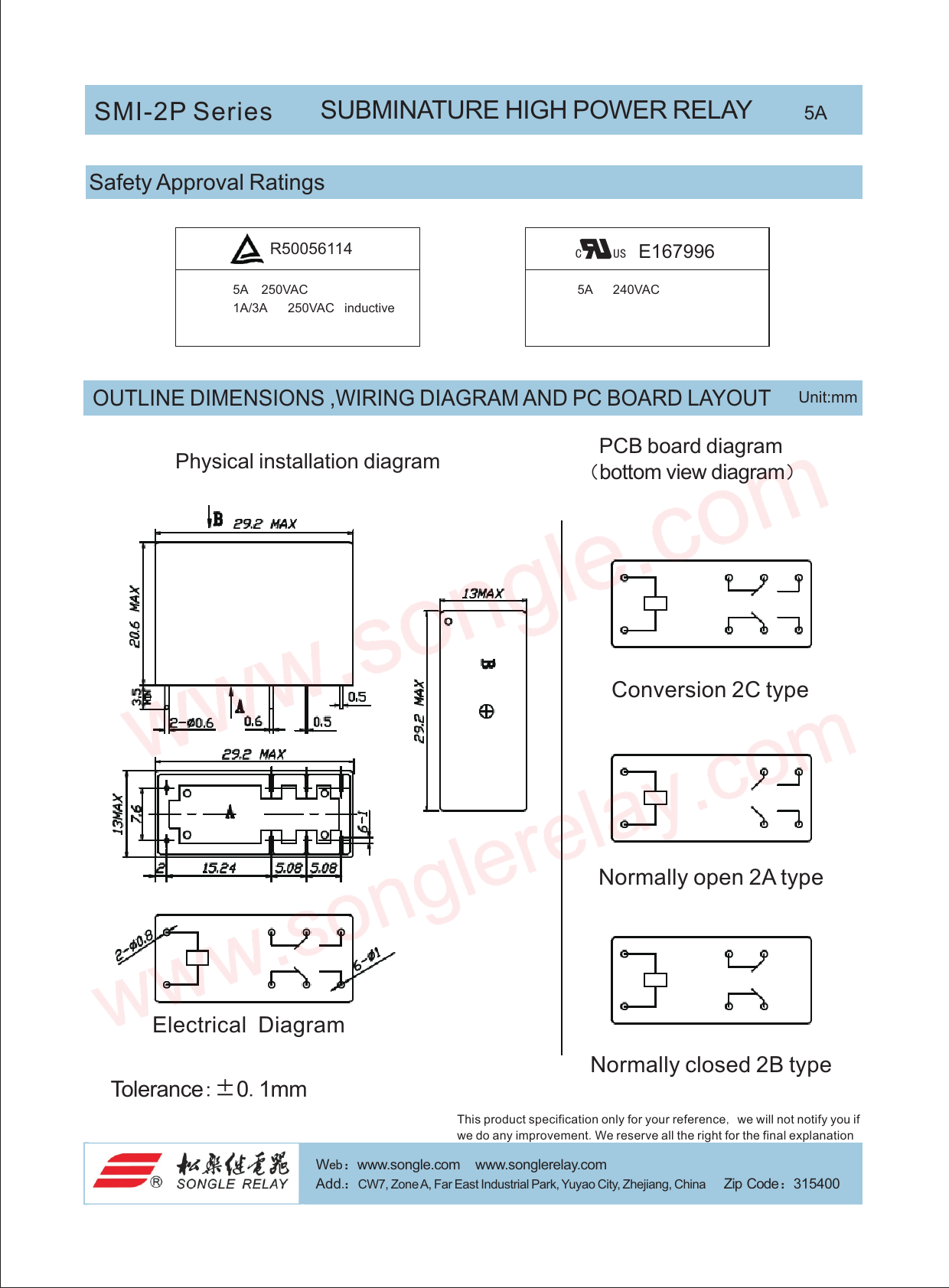 SMI-2P Series SUBMINATURE HIGH POWER RELAY 5A Safety Approval Ratings R50056114 C US E167996 5A 250VAC 5A 240VAC 1A/3A 250VAC inductive OUTLINE DIMENSIONS ,WIRING DIAGRAM AND PC BOARD LAYOUT Unit:mm PCB board diagram Physical installation diagram (bottom view diagram) Conversion 2C type Normally open 2A type Electrical Diagram Normally closed 2B type Tolerance:±0.1mm This product specification only for your reference, we will not notify you if we do any improvement.We reserve all the right for the final explanation Web:www.songle.com www.songlerelay.com Email:sale@songle.com Web:www.songle.com www.songlerelay.com Add.:CW7, Zone A, Far East Industrial Park, Yuyao City, Zhejiang, China i Z p Code:315400 Add.:CW7, Zone A, Far East Industrial Park, Yuyao City, Zhejiang, China Zip Code:315400 Tel.: +86 574 62717777 62762658 62721968 a F x:+86 574 62721978 Document Outline 页 1 页 2