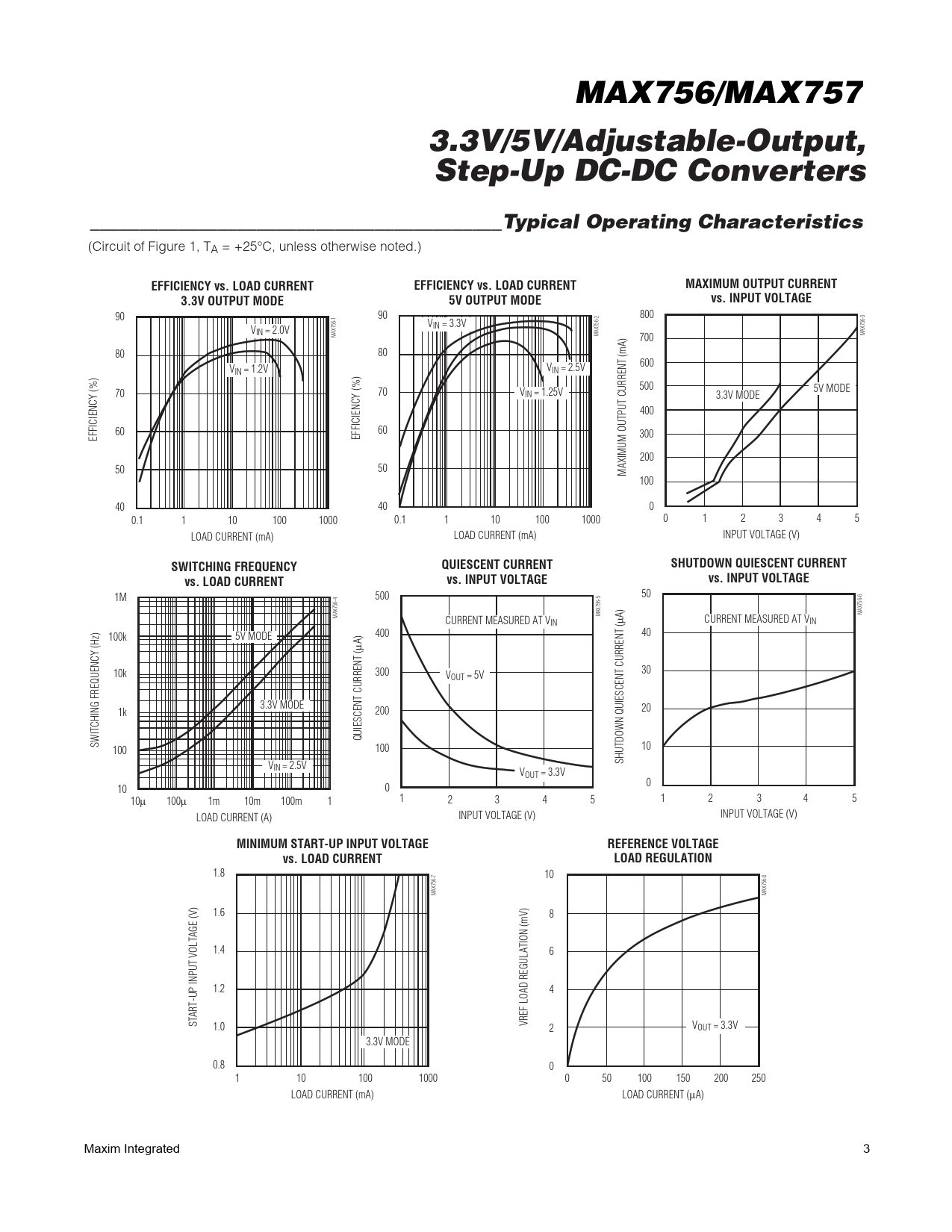 1.8 10 MAX756-7 MAX756-8 1.6 8 1.4 6 1.2 4 START-UP INPUT VOLTAGE (V) 1.0 VREF LOAD REGULATION (mV) 2 VOUT = 3.3V 3.3V MODE 0.8 0 1 10 100 1000 0 50 100 150 200 250 LOAD CURRENT (mA) LOAD CURRENT (μA) Maxim Integrated 3