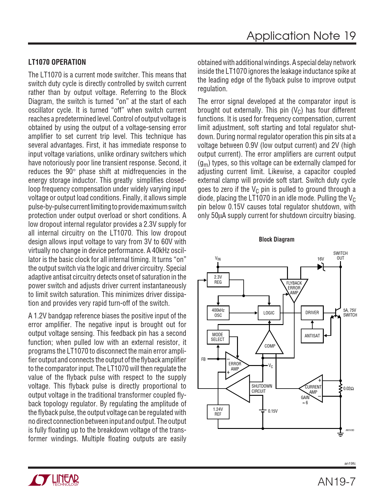 BeschreibungApplication Note 19. This design manual is an extensive discussion of all standard switching configurations for the LT1070; including buck, boost, flyback, forward, inverting and "Cuk." The manual includes comprehensive information on the LT1070, the external components used with it, and complete formulas for calculating component values.