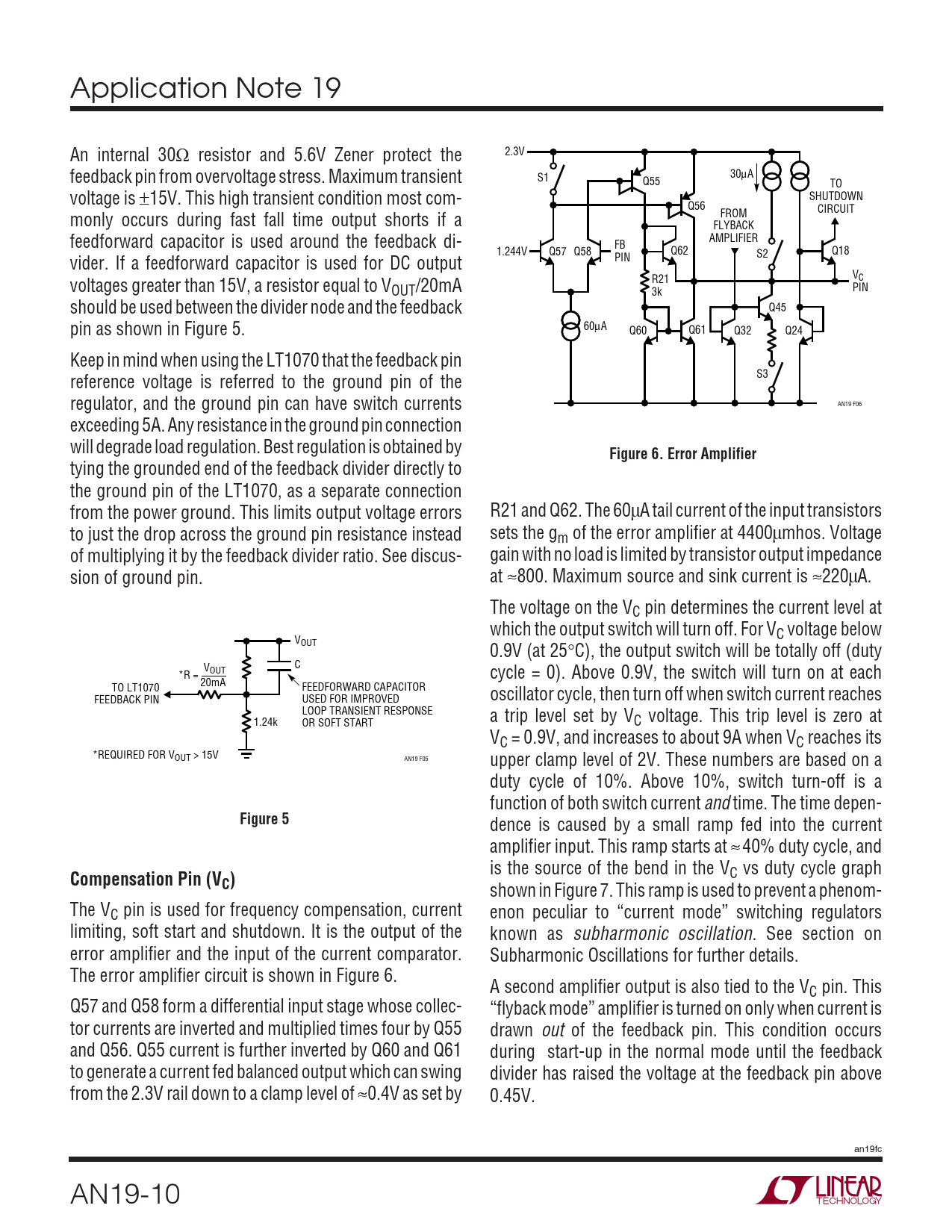 shown in Figure 7. This ramp is used to prevent a phenom- The VC pin is used for frequency compensation, current enon peculiar to “current mode” switching regulators limiting, soft start and shutdown. It is the output of the known as subharmonic oscillation. See section on error amplifier and the input of the current comparator. Subharmonic Oscillations for further details. The error amplifier circuit is shown in Figure 6. A second amplifier output is also tied to the VC pin. This Q57 and Q58 form a differential input stage whose collec- “flyback mode” amplifier is turned on only when current is tor currents are inverted and multiplied times four by Q55 drawn out of the feedback pin. This condition occurs and Q56. Q55 current is further inverted by Q60 and Q61 during start-up in the normal mode until the feedback to generate a current fed balanced output which can swing divider has raised the voltage at the feedback pin above from the 2.3V rail down to a clamp level of ≈0.4V as set by 0.45V. an19fc AN19-10
