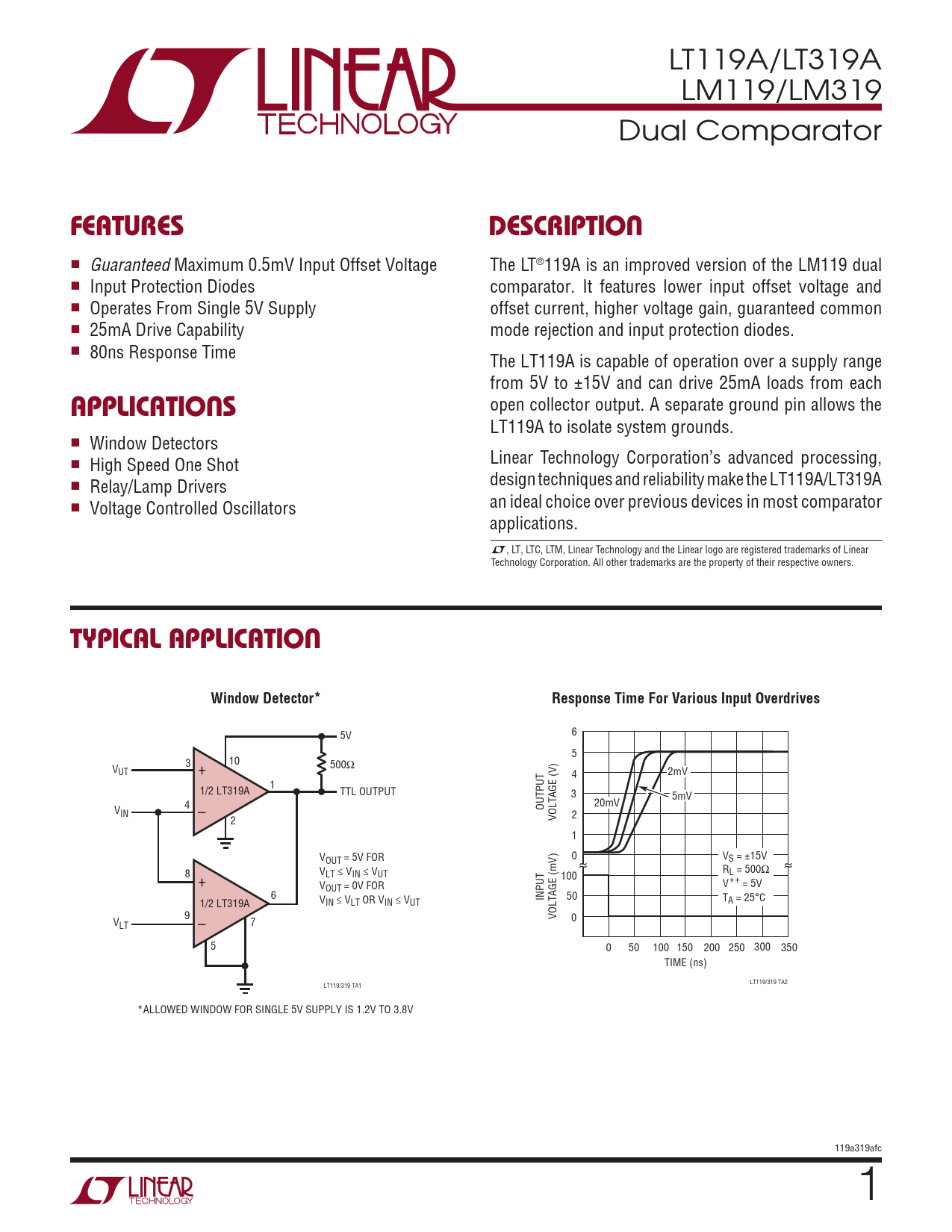 LT119A/LT319A LM119/LM319 Dual Comparator FEATURESDESCRIPTION n Guaranteed Maximum 0.5mV Input Offset Voltage The LT®119A is an improved version of the LM119 dual n Input Protection Diodes comparator. It features lower input offset voltage and n Operates From Single 5V Supply offset current, higher voltage gain, guaranteed common n 25mA Drive Capability mode rejection and input protection diodes. n 80ns Response Time The LT119A is capable of operation over a supply range from 5V to ±15V and can drive 25mA loads from each APPLICATIONS open collector output. A separate ground pin allows the LT119A to isolate system grounds. n Window Detectors n Linear Technology Corporation’s advanced processing, High Speed One Shot n design techniques and reliability make the LT119A/LT319A Relay/Lamp Drivers n an ideal choice over previous devices in most comparator Voltage Controlled Oscillators applications. L, LT, LTC, LTM, Linear Technology and the Linear logo are registered trademarks of Linear Technology Corporation. All other trademarks are the property of their respective owners. TYPICAL APPLICATIONWindow Detector*Response Time For Various Input Overdrives 5V 6 5 VUT + 3 10 500Ω 4 2mV 1 1/2 LT319A TTL OUTPUT 3 20mV 5mV V OUTPUT IN – 4 2 VOLTAGE (V) 2 1 VOUT = 5V FOR 0 VS = ±15V 8 R + VLT ≤ VIN ≤ VUT 100 L = 500Ω VOUT = 0V FOR V++ = 5V 6 INPUT 50 1/2 LT319A VIN ≤ VLT OR VIN ≤ VUT TA = 25°C 9 VOLTAGE (mV) V 0 LT – 7 5 0 50 100 150 200 250 300 350 TIME (ns) LT119/319 TA2 LT119/319 TA1 *ALLOWED WINDOW FOR SINGLE 5V SUPPLY IS 1.2V TO 3.8V 119a319afc 1 Document Outline Features Applications Description Typical Application Absolute Maximum Ratings Pin Configuration Order Information Electrical Characteristics Typical Performance Characteristics Typical Applications Schematic Diagram Package Description Revision History Typical Application