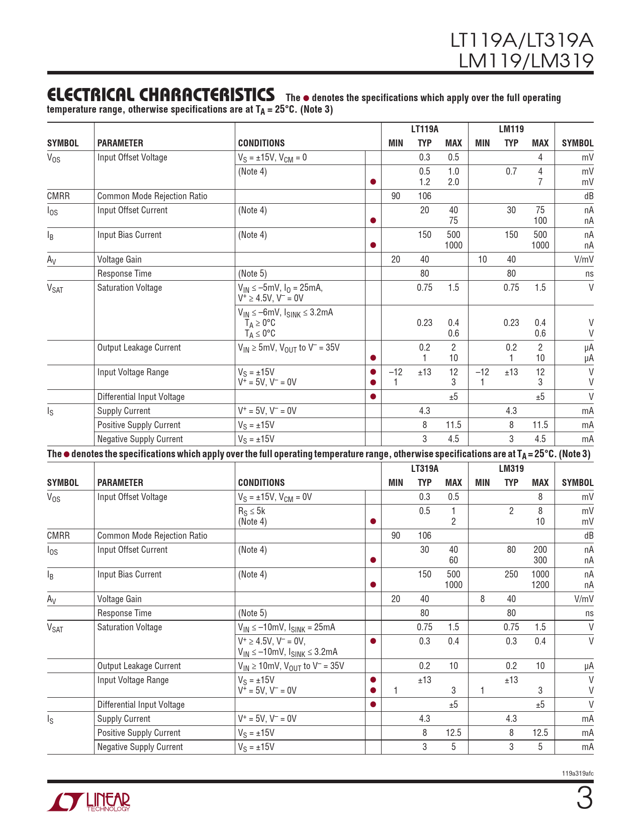 LT119A/LT319A LM119/LM319 ELECTRICAL CHARACTERISTICS The l denotes the specifications which apply over the full operatingtemperature range, otherwise specifications are at TA = 25°C. (Note 3)LT119ALM119SYMBOLPARAMETERCONDITIONSMINTYPMAXMINTYPMAXSYMBOL VOS Input Offset Voltage VS = ±15V, VCM = 0 0.3 0.5 4 mV (Note 4) 0.5 1.0 0.7 4 mV l 1.2 2.0 7 mV CMRR Common Mode Rejection Ratio 90 106 dB IOS Input Offset Current (Note 4) 20 40 30 75 nA l 75 100 nA IB Input Bias Current (Note 4) 150 500 150 500 nA l 1000 1000 nA AV Voltage Gain 20 40 10 40 V/mV Response Time (Note 5) 80 80 ns VSAT Saturation Voltage VIN ≤ –5mV, IO = 25mA, 0.75 1.5 0.75 1.5 V V+ ≥ 4.5V, V– = 0V VIN ≤ –6mV, ISINK ≤ 3.2mA TA ≥ 0°C 0.23 0.4 0.23 0.4 V TA ≤ 0°C 0.6 0.6 V Output Leakage Current VIN ≥ 5mV, VOUT to V– = 35V 0.2 2 0.2 2 µA l 1 10 1 10 µA Input Voltage Range VS = ±15V l –12 ±13 12 –12 ±13 12 V V+ = 5V, V– = 0V l 1 3 1 3 V Differential Input Voltage l ±5 ±5 V IS Supply Current V+ = 5V, V– = 0V 4.3 4.3 mA Positive Supply Current VS = ±15V 8 11.5 8 11.5 mA Negative Supply Current VS = ±15V 3 4.5 3 4.5 mA The l denotes the specifications which apply over the full operating temperature range, otherwise specifications are at TA = 25°C. (Note 3)LT319ALM319SYMBOLPARAMETERCONDITIONSMINTYPMAXMINTYPMAXSYMBOL VOS Input Offset Voltage VS = ±15V, VCM = 0V 0.3 0.5 8 mV RS ≤ 5k 0.5 1 2 8 mV (Note 4) l 2 10 mV CMRR Common Mode Rejection Ratio 90 106 dB IOS Input Offset Current (Note 4) 30 40 80 200 nA l 60 300 nA IB Input Bias Current (Note 4) 150 500 250 1000 nA l 1000 1200 nA AV Voltage Gain 20 40 8 40 V/mV Response Time (Note 5) 80 80 ns VSAT Saturation Voltage VIN ≤ –10mV, ISINK = 25mA 0.75 1.5 0.75 1.5 V V+ ≥ 4.5V, V– = 0V, l 0.3 0.4 0.3 0.4 V VIN ≤ –10mV, ISINK ≤ 3.2mA Output Leakage Current VIN ≥ 10mV, VOUT to V– = 35V 0.2 10 0.2 10 µA Input Voltage Range VS = ±15V l ±13 ±13 V V+ = 5V, V– = 0V l 1 3 1 3 V Differential Input Voltage l ±5 ±5 V IS Supply Current V+ = 5V, V– = 0V 4.3 4.3 mA Positive Supply Current VS = ±15V 8 12.5 8 12.5 mA Negative Supply Current VS = ±15V 3 5 3 5 mA 119a319afc 3 Document Outline Features Applications Description Typical Application Absolute Maximum Ratings Pin Configuration Order Information Electrical Characteristics Typical Performance Characteristics Typical Applications Schematic Diagram Package Description Revision History Typical Application
