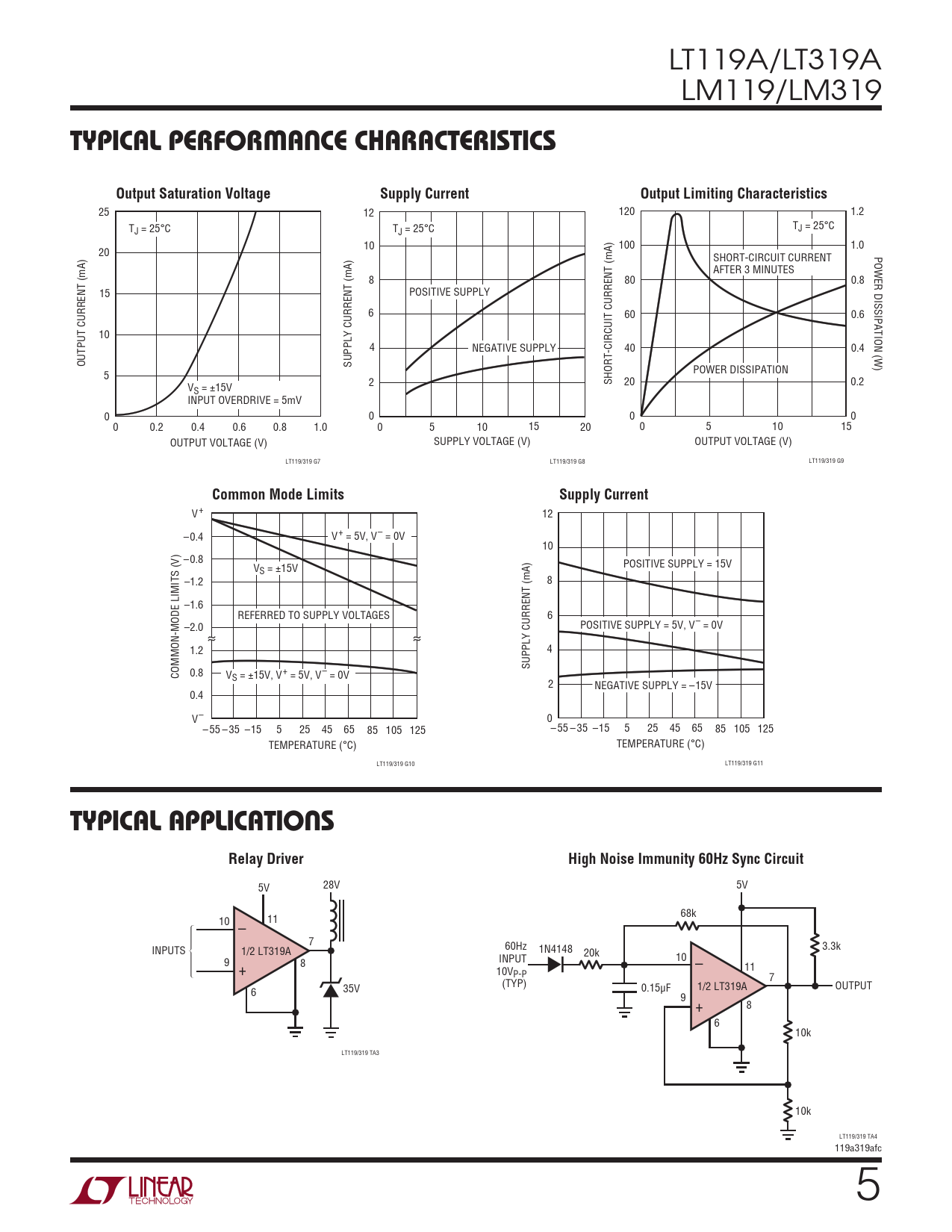 5V 28V 5V 68k 10 11 – 7 INPUTS 1/2 LT319A 60Hz 3.3k 1N4148 20k 9 8 INPUT 10 + – 11 10VP-P 7 (TYP) 6 35V 0.15µF 1/2 LT319A OUTPUT 9 8 + 6 10k LT119/319 TA3 10k LT119/319 TA4 119a319afc 5 Document Outline Features Applications Description Typical Application Absolute Maximum Ratings Pin Configuration Order Information Electrical Characteristics Typical Performance Characteristics Typical Applications Schematic Diagram Package Description Revision History Typical Application
