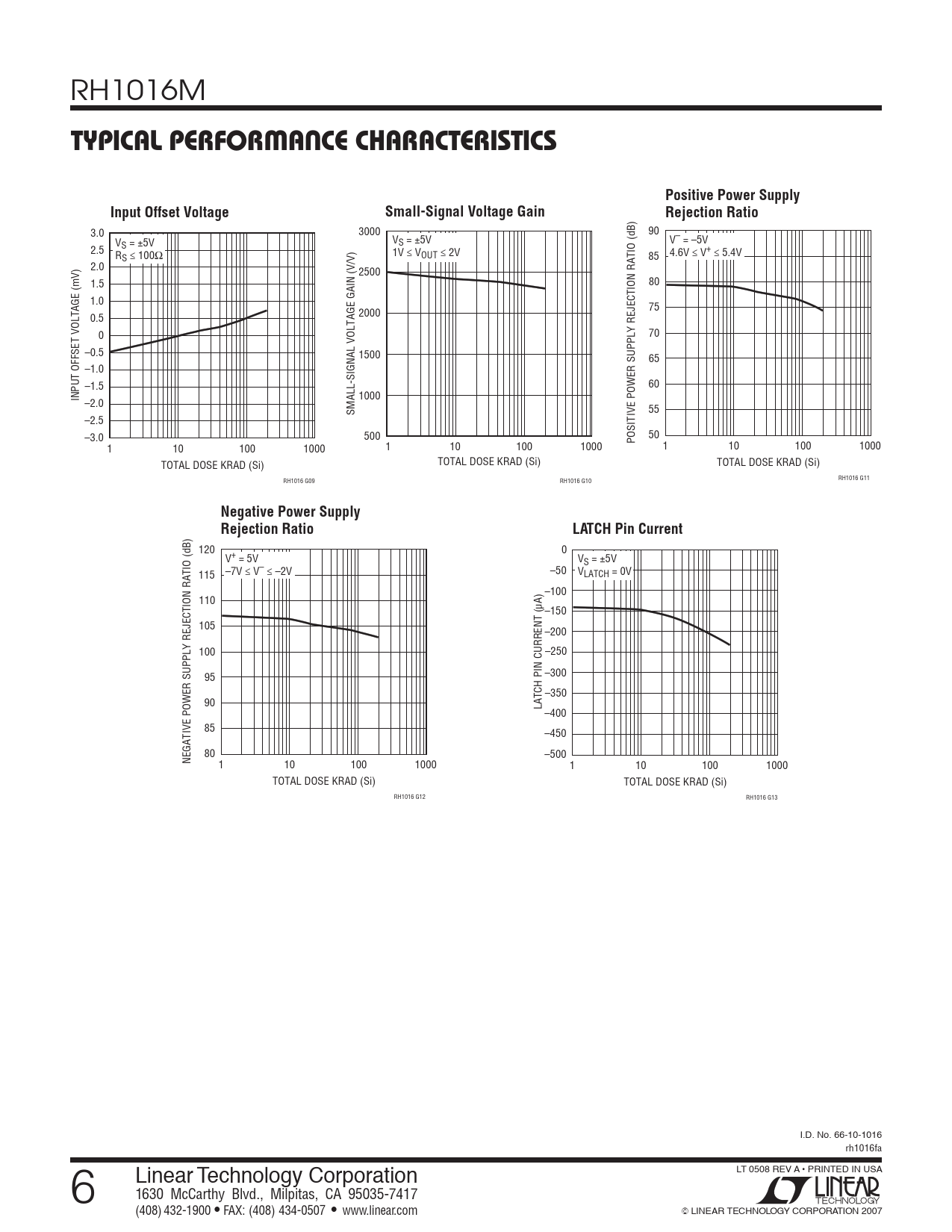 120 0 V+ = 5V VS = ±5V 115 –7V ≤ V– ≤ –2V –50 VLATCH = 0V –100 110 –150 105 –200 100 –250 95 –300 –350 90 LATCH PIN CURRENT (μA) –400 85 –450 80 –500 NEGATIVE POWER SUPPLY REJECTION RATIO (dB) 1 10 100 1000 1 10 100 1000 TOTAL DOSE KRAD (Si) TOTAL DOSE KRAD (Si) RH1016 G12 RH1016 G13 I.D. No. 66-10-1016 rh1016fa 6 Linear Technology Corporation LT 0508 REV A • PRINTED IN USA 1630 McCarthy Blvd., Milpitas, CA 95035-7417 (408) 432-1900 ● FAX: (408) 434-0507 ● www.linear.com © LINEAR TECHNOLOGY CORPORATION 2007