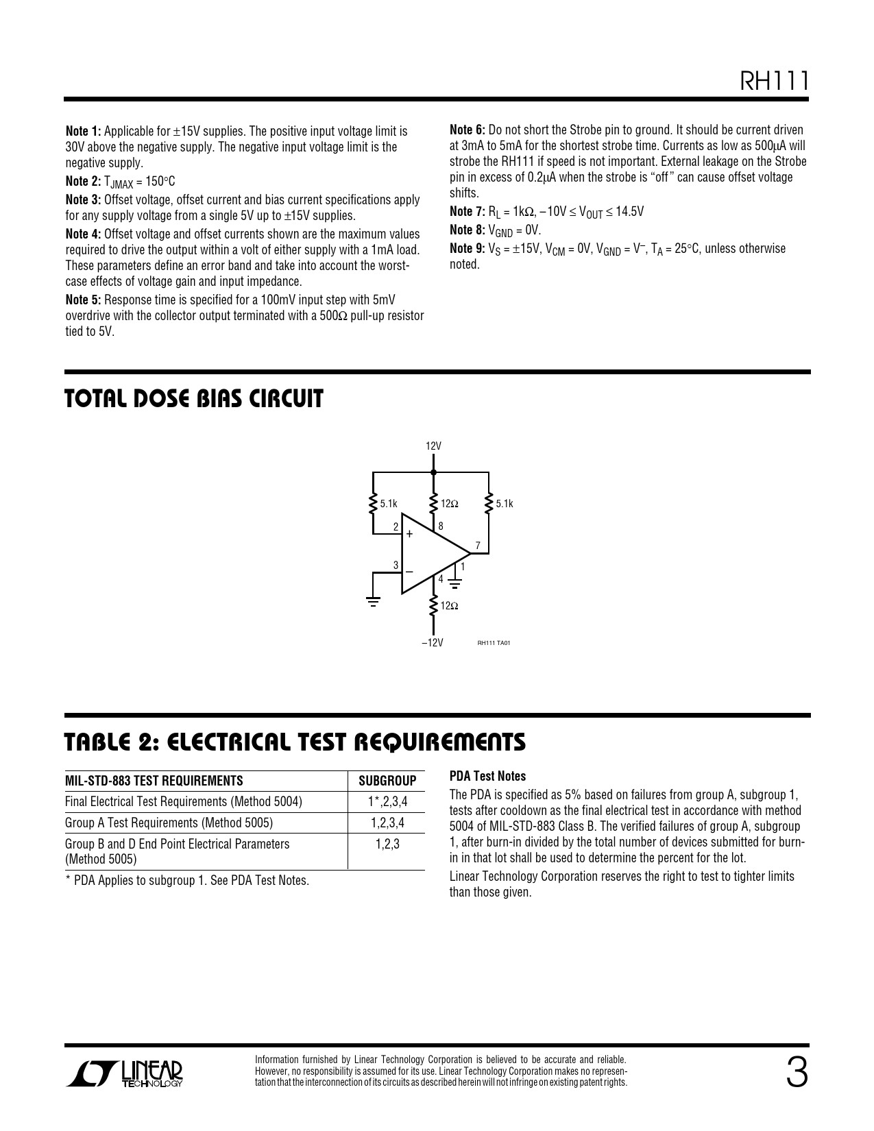 The PDA is specified as 5% based on failures from group A, subgroup 1, Final Electrical Test Requirements (Method 5004) 1*,2,3,4 tests after cooldown as the final electrical test in accordance with method Group A Test Requirements (Method 5005) 1,2,3,4 5004 of MIL-STD-883 Class B. The verified failures of group A, subgroup Group B and D End Point Electrical Parameters 1,2,3 1, after burn-in divided by the total number of devices submitted for burn- (Method 5005) in in that lot shall be used to determine the percent for the lot. * PDA Applies to subgroup 1. See PDA Test Notes. Linear Technology Corporation reserves the right to test to tighter limits than those given. Information furnished by Linear Technology Corporation is believed to be accurate and reliable. However, no responsibility is assumed for its use. Linear Technology Corporation makes no represen- tation that the interconnection of its circuits as described herein will not infringe on existing patent rights. 3