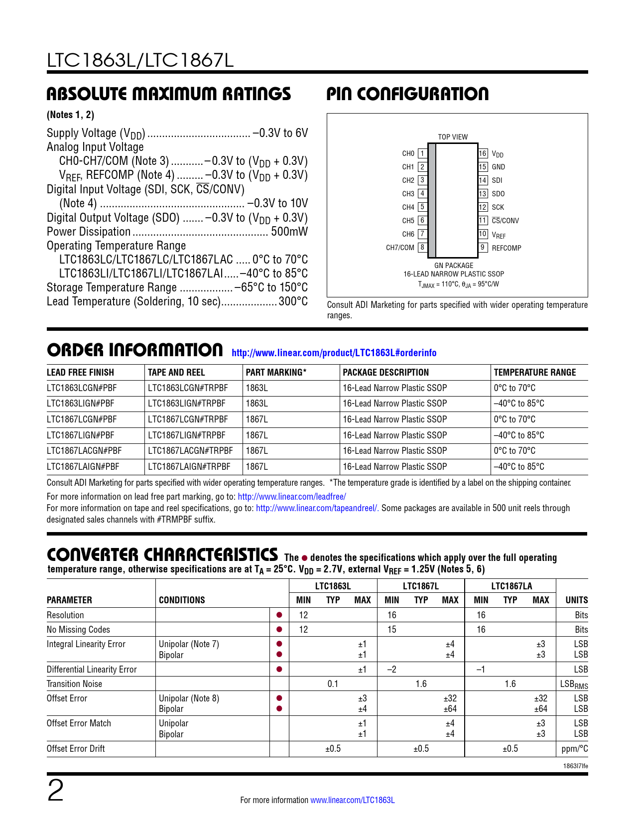 LTC1863L/LTC1867L ABSOLUTE MAXIMUM RATINGSPIN CONFIGURATION(Notes 1, 2) Supply Voltage (VDD) ... –0.3V to 6V TOP VIEW Analog Input Voltage CH0-CH7/COM (Note 3) ...–0.3V to (V CH0 1 16 VDD DD + 0.3V) CH1 2 V 15 GND REF, REFCOMP (Note 4) ... –0.3V to (VDD + 0.3V) CH2 3 14 SDI Digital Input Voltage (SDI, SCK, CS/CONV) CH3 4 13 SDO (Note 4) ... –0.3V to 10V CH4 5 12 SCK Digital Output Voltage (SDO) ... –0.3V to (VDD + 0.3V) CH5 6 11 CS/CONV Power Dissipation .. 500mW CH6 7 10 VREF Operating Temperature Range CH7/COM 8 9 REFCOMP LTC1863LC/LTC1867LC/LTC1867LAC ... 0°C to 70°C LTC1863LI/LTC1867LI/LTC1867LAI ...–40°C to 85°C GN PACKAGE 16-LEAD NARROW PLASTIC SSOP Storage Temperature Range .. –65°C to 150°C TJMAX = 110°C, θJA = 95°C/W Lead Temperature (Soldering, 10 sec) ...300°C Consult ADI Marketing for parts specified with wider operating temperature ranges. ORDER INFORMATION http://www.linear.com/product/LTC1863L#orderinfoLEAD FREE FINISHTAPE AND REELPART MARKING*PACKAGE DESCRIPTIONTEMPERATURE RANGE LTC1863LCGN#PBF LTC1863LCGN#TRPBF 1863L 16-Lead Narrow Plastic SSOP 0°C to 70°C LTC1863LIGN#PBF LTC1863LIGN#TRPBF 1863L 16-Lead Narrow Plastic SSOP –40°C to 85°C LTC1867LCGN#PBF LTC1867LCGN#TRPBF 1867L 16-Lead Narrow Plastic SSOP 0°C to 70°C LTC1867LIGN#PBF LTC1867LIGN#TRPBF 1867L 16-Lead Narrow Plastic SSOP –40°C to 85°C LTC1867LACGN#PBF LTC1867LACGN#TRPBF 1867L 16-Lead Narrow Plastic SSOP 0°C to 70°C LTC1867LAIGN#PBF LTC1867LAIGN#TRPBF 1867L 16-Lead Narrow Plastic SSOP –40°C to 85°C Consult ADI Marketing for parts specified with wider operating temperature ranges. *The temperature grade is identified by a label on the shipping container. For more information on lead free part marking, go to: http://www.linear.com/leadfree/ For more information on tape and reel specifications, go to: http://www.linear.com/tapeandreel/. Some packages are available in 500 unit reels through designated sales channels with #TRMPBF suffix. CONVERTER CHARACTERISTICSThe l denotes the specifications which apply over the full operatingtemperature range, otherwise specifications are at TA = 25°C. VDD = 2.7V, external VREF = 1.25V (Notes 5, 6)LTC1863LLTC1867LLTC1867LAPARAMETERCONDITIONSMINTYPMAXMINTYPMAXMINTYPMAXUNITS Resolution l 12 16 16 Bits No Missing Codes l 12 15 16 Bits Integral Linearity Error Unipolar (Note 7) l ±1 ±4 ±3 LSB Bipolar l ±1 ±4 ±3 LSB Differential Linearity Error l ±1 –2 –1 LSB Transition Noise 0.1 1.6 1.6 LSBRMS Offset Error Unipolar (Note 8) l ±3 ±32 ±32 LSB Bipolar l ±4 ±64 ±64 LSB Offset Error Match Unipolar ±1 ±4 ±3 LSB Bipolar ±1 ±4 ±3 LSB Offset Error Drift ±0.5 ±0.5 ±0.5 ppm/°C 1863l7lfe 2 For more information www.linear.com/LTC1863L Document Outline Description Absolute Maximum Ratings Pin Configuration Typical Performance Characteristics Pin Functions Package Description Related Parts