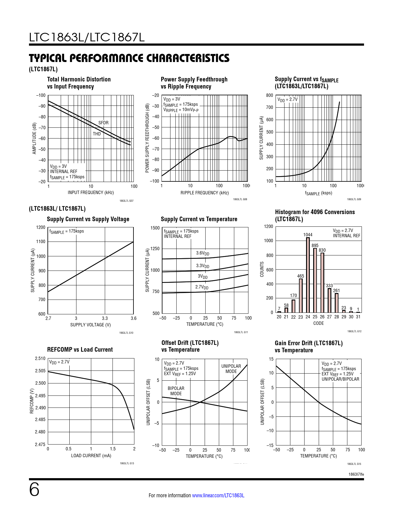 TYPICAL PERFORMANCE CHARACTERISTICS (LTC1867L) Total Harmonic Distortion Power Supply Feedthrough Supply Current vs fSAMPLE vs Input Frequency vs Ripple Frequency (LTC1863L/LTC1867L)