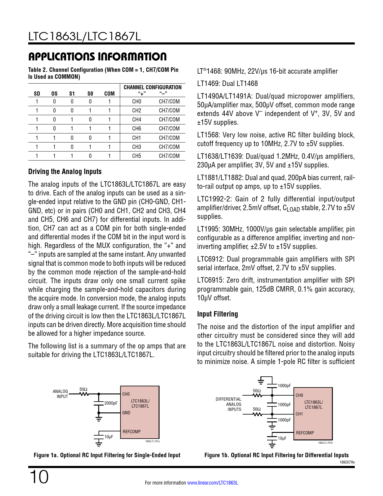 LTC1863L/LTC1867L APPLICATIONS INFORMATION Table 2. Channel Configuration (When COM = 1, CH7/COM Pin LT®1468: 90MHz, 22V/µs 16-bit accurate amplifier Is Used as COMMON) LT1469: Dual LT1468 CHANNEL CONFIGURATIONSDOSS1S0COM“+” “–” LT1490A/LT1491A: Dual/quad micropower amplifiers, 1 0 0 0 1 CH0 CH7/COM 50µA/amplifier max, 500µV offset, common mode range 1 0 0 1 1 CH2 CH7/COM extends 44V above V– independent of V+, 3V, 5V and 1 0 1 0 1 CH4 CH7/COM ±15V supplies. 1 0 1 1 1 CH6 CH7/COM 1 1 0 0 1 CH1 CH7/COM LT1568: Very low noise, active RC filter building block, 1 1 0 1 1 CH3 CH7/COM cutoff frequency up to 10MHz, 2.7V to ±5V supplies. 1 1 1 0 1 CH5 CH7/COM LT1638/LT1639: Dual/quad 1.2MHz, 0.4V/µs amplifiers, 230µA per amplifier, 3V, 5V and ±15V supplies. Driving the Analog Inputs LT1881/LT1882: Dual and quad, 200pA bias current, rail- The analog inputs of the LTC1863L/LTC1867L are easy to-rail output op amps, up to ±15V supplies. to drive. Each of the analog inputs can be used as a sin- gle-ended input relative to the GND pin (CH0-GND, CH1- LTC1992-2: Gain of 2 ful y differential input/output GND, etc) or in pairs (CH0 and CH1, CH2 and CH3, CH4 amplifier/driver, 2.5mV offset, CLOAD stable, 2.7V to ±5V and CH5, CH6 and CH7) for differential inputs. In addi- supplies. tion, CH7 can act as a COM pin for both single-ended LT1995: 30MHz, 1000V/µs gain selectable amplifier, pin and differential modes if the COM bit in the input word is configurable as a difference amplifier, inverting and non- high. Regardless of the MUX configuration, the “+” and inverting amplifier, ±2.5V to ±15V supplies. “–” inputs are sampled at the same instant. Any unwanted signal that is common mode to both inputs will be reduced LTC6912: Dual programmable gain amplifiers with SPI by the common mode rejection of the sample-and-hold serial interface, 2mV offset, 2.7V to ±5V supplies. circuit. The inputs draw only one small current spike LTC6915: Zero drift, instrumentation amplifier with SPI while charging the sample-and-hold capacitors during programmable gain, 125dB CMRR, 0.1% gain accuracy, the acquire mode. In conversion mode, the analog inputs 10µV offset. draw only a small leakage current. If the source impedance of the driving circuit is low then the LTC1863L/LTC1867L Input Filtering inputs can be driven directly. More acquisition time should The noise and the distortion of the input amplifier and be allowed for a higher impedance source. other circuitry must be considered since they will add The following list is a summary of the op amps that are to the LTC1863L/LTC1867L noise and distortion. Noisy suitable for driving the LTC1863L/LTC1867L. input circuitry should be filtered prior to the analog inputs to minimize noise. A simple 1-pole RC filter is sufficient 1000pF 50Ω ANALOG 50Ω CH0 INPUT CH0 LTC1863L/ DIFFERENTIAL 2000pF LTC1863L/ LTC1867L ANALOG 1000pF LTC1867L INPUTS 50Ω GND CH1 1000pF REFCOMP REFCOMP 10µF 10µF 1863L7L F01a 1863L7L F01b Figure 1a. Optional RC Input Filtering for Single-Ended InputFigure 1b. Optional RC Input Filtering for Differential Inputs 1863l7lfe 10 For more information www.linear.com/LTC1863L Document Outline Description Absolute Maximum Ratings Pin Configuration Typical Performance Characteristics Pin Functions Package Description Related Parts