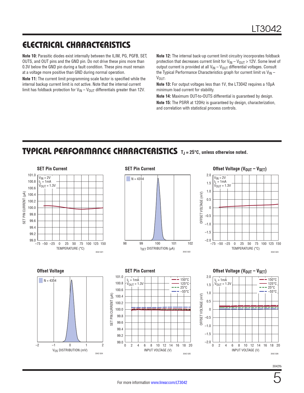 LT3042 ELECTRICAL CHARACTERISTICS Note 10: Parasitic diodes exist internally between the ILIM, PG, PGFB, SET, Note 12: The internal back-up current limit circuitry incorporates foldback OUTS, and OUT pins and the GND pin. Do not drive these pins more than protection that decreases current limit for VIN – VOUT > 12V. Some level of 0.3V below the GND pin during a fault condition. These pins must remain output current is provided at all VIN – VOUT differential voltages. Consult at a voltage more positive than GND during normal operation. the Typical Performance Characteristics graph for current limit vs VIN – Note 11: The current limit programming scale factor is specified while the VOUT. internal backup current limit is not active. Note that the internal current Note 13: For output voltages less than 1V, the LT3042 requires a 10µA limit has foldback protection for VIN – VOUT differentials greater than 12V. minimum load current for stability. Note 14: Maximum OUT-to-OUTS differential is guaranteed by design. Note 15: The PSRR at 120Hz is guaranteed by design, characterization, and correlation with statistical process controls. TYPICAL PERFORMANCE CHARACTERISTICS TJ = 25°C, unless otherwise noted.SET Pin CurrentSET Pin CurrentOffset Voltage (VOUT – VSET) 101.0 2.0 VIN = 2V V N = 4354 IN = 2V 100.8 IL = 1mA 1.5 IL = 1mA V V 100.6 OUT = 1.3V OUT = 1.3V 1.0 100.4 100.2 0.5 100.0 TAGE (mV) 0 99.8 –0.5 SET PIN CURRENT (µA) 99.6 OFFSET VOL –1.0 99.4 99.2 –1.5 99.0 –2.0 –75 –50 –25 0 25 50 75 100 125 150 98 99 100 101 102 –75 –50 –25 0 25 50 75 100 125 150 TEMPERATURE (°C) ISET DISTRIBUTION (µA) TEMPERATURE (°C) 3042 G01 3042 G02 3042 G03 Offset VoltageSET Pin CurrentOffset Voltage (VOUT – VSET) 101.0 2.0 N = 4354 IL = 1mA 150°C IL = 1mA 150°C 100.8 VOUT = 1.3V 125°C 1.5 VOUT = 1.3V 125°C 25°C 25°C 100.6 –55°C 1.0 –55°C 100.4 100.2 0.5 100.0 TAGE (mV) 0 99.8 –0.5 SET PIN CURRENT (µA) 99.6 OFFSET VOL –1.0 99.4 99.2 –1.5 99.0 –2.0 –2 –1 0 1 2 0 2 4 6 8 10 12 14 16 18 20 0 2 4 6 8 10 12 14 16 18 20 VOS DISTRIBUTION (mV) INPUT VOLTAGE (V) INPUT VOLTAGE (V) 3042 G04 3042 G05 3042 G06 3042fb For more information www.linear.com/LT3042 5 Document Outline Features Applications Typical Application Description Absolute Maximum Ratings Pin Configuration Order Information Electrical Characteristics Typical Performance Characteristics Pin Functions Block Diagram Applications Information Typical Applications Package Description Revision History Typical Application Related Parts