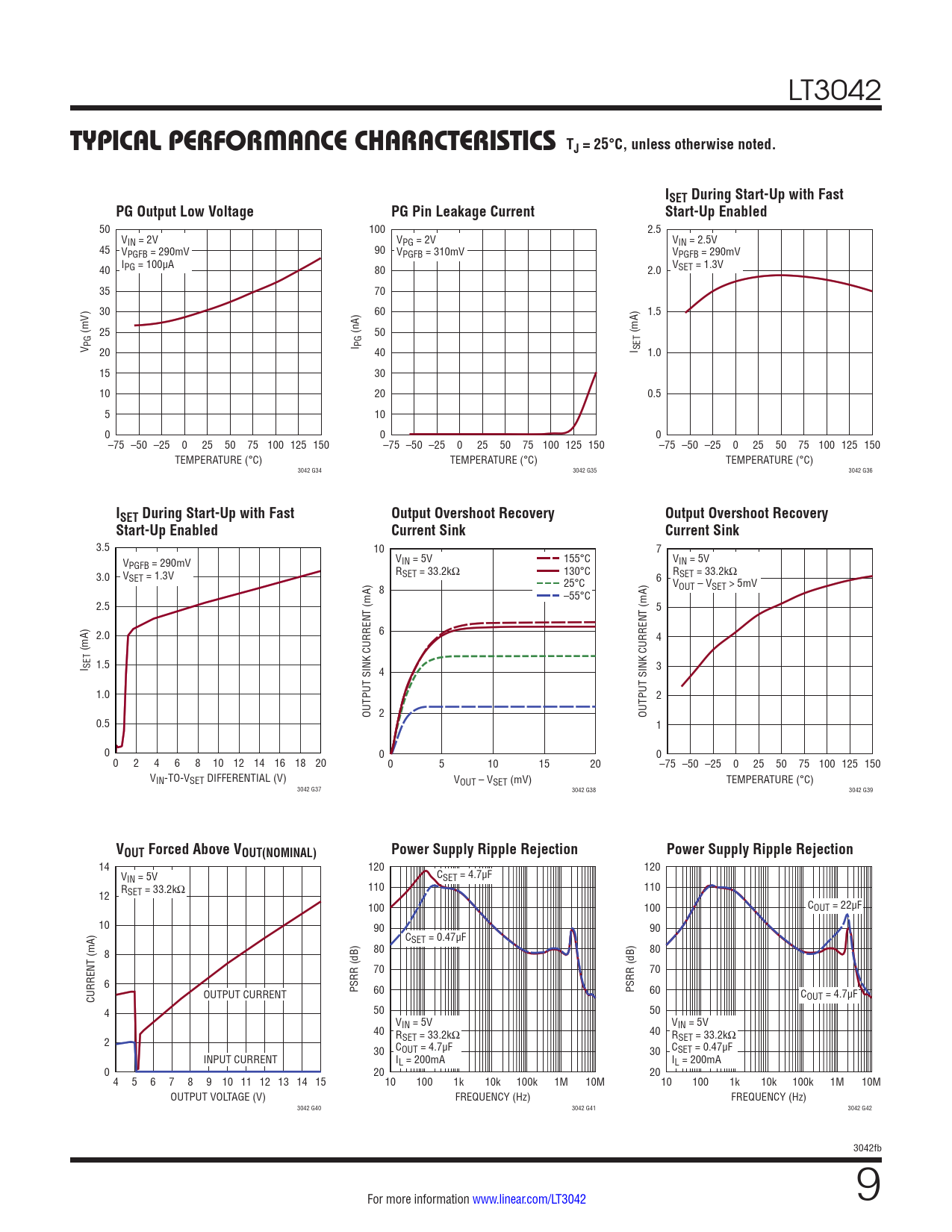 50 100 2.5 VIN = 2V VPG = 2V VIN = 2.5V 45 VPGFB = 290mV 90 VPGFB = 310mV VPGFB = 290mV 40 IPG = 100µA 80 2.0 VSET = 1.3V 35 70 30 60 1.5 (mV) 25 (nA) 50 (mA) V PG I PG 20 40 I SET 1.0 15 30 10 20 0.5 5 10 0 0 0 –75 –50 –25 0 25 50 75 100 125 150 –75 –50 –25 0 25 50 75 100 125 150 –75 –50 –25 0 25 50 75 100 125 150 TEMPERATURE (°C) TEMPERATURE (°C) TEMPERATURE (°C) 3042 G34 3042 G35 3042 G36