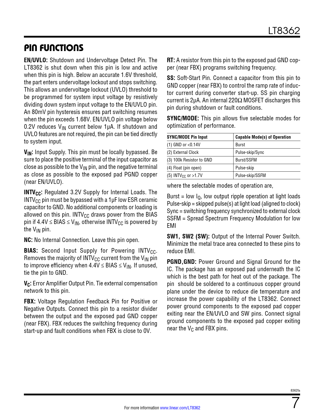 PIN FUNCTIONS EN/UVLO:. RT:. SS:. SYNC/MODE:. SYNC/MODE Pin Input. Capable Mode(s) of Operation. VIN:. INTVCC:. NC:. SW1, SW2 (SW):. BIAS:
