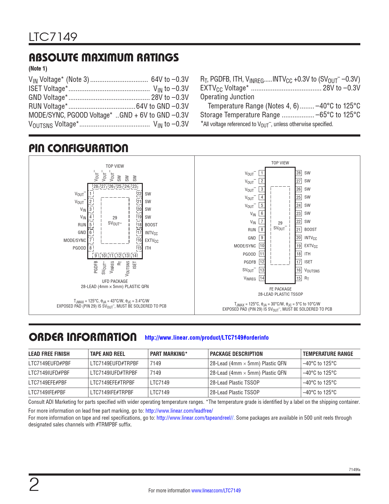(Note 1). http://www.linear.com/product/LTC7149#orderinfo. LEAD FREE FINISH. TAPE AND REEL. PART MARKING*. PACKAGE DESCRIPTION