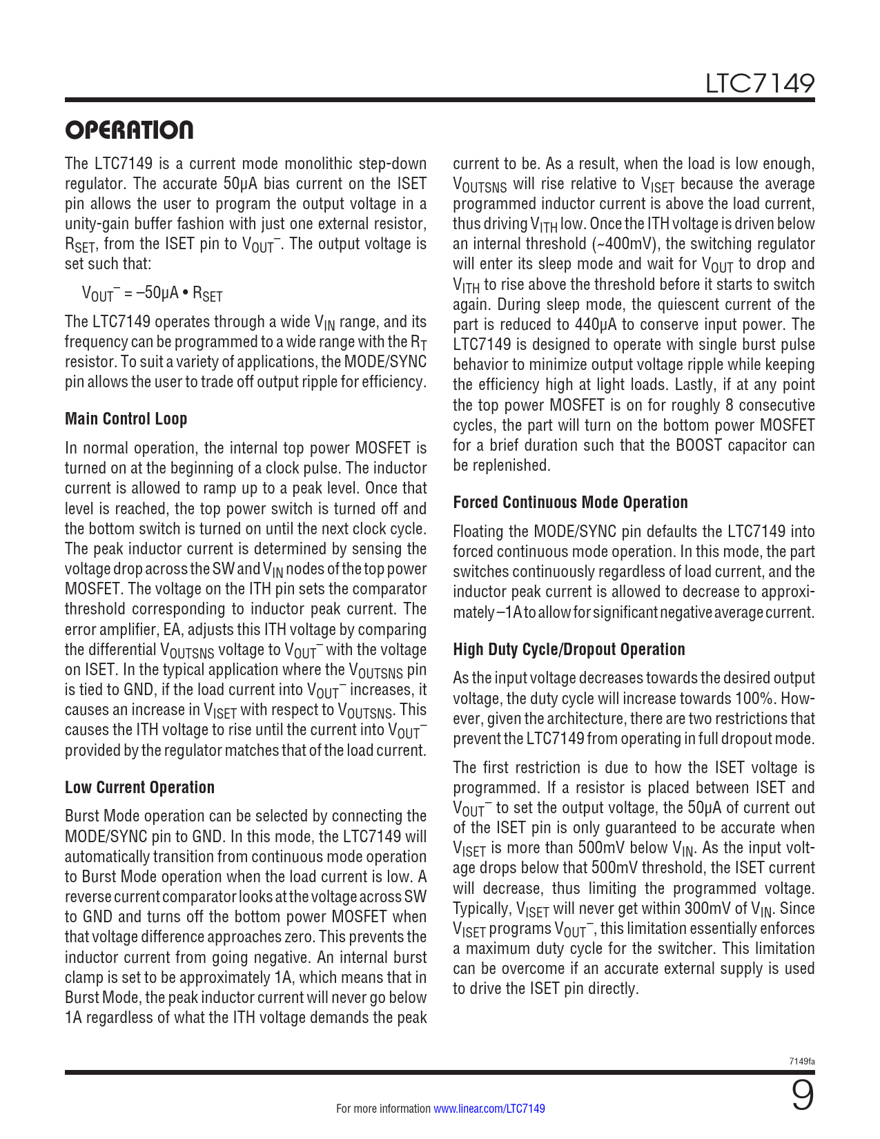 LTC7149 OPERATION The LTC7149 is a current mode monolithic step-down current to be. As a result, when the load is low enough, regulator. The accurate 50μA bias current on the ISET VOUTSNS will rise relative to VISET because the average pin allows the user to program the output voltage in a programmed inductor current is above the load current, unity-gain buffer fashion with just one external resistor, thus driving VITH low. Once the ITH voltage is driven below R – SET, from the ISET pin to VOUT . The output voltage is an internal threshold (~400mV), the switching regulator set such that: will enter its sleep mode and wait for VOUT to drop and V – VITH to rise above the threshold before it starts to switch OUT = –50μA • RSET again. During sleep mode, the quiescent current of the The LTC7149 operates through a wide VIN range, and its part is reduced to 440µA to conserve input power. The frequency can be programmed to a wide range with the RT LTC7149 is designed to operate with single burst pulse resistor. To suit a variety of applications, the MODE/SYNC behavior to minimize output voltage ripple while keeping pin allows the user to trade off output ripple for efficiency. the efficiency high at light loads. Lastly, if at any point the top power MOSFET is on for roughly 8 consecutive Main Control Loop cycles, the part will turn on the bottom power MOSFET In normal operation, the internal top power MOSFET is for a brief duration such that the BOOST capacitor can turned on at the beginning of a clock pulse. The inductor be replenished. current is allowed to ramp up to a peak level. Once that level is reached, the top power switch is turned off and Forced Continuous Mode Operation the bottom switch is turned on until the next clock cycle. Floating the MODE/SYNC pin defaults the LTC7149 into The peak inductor current is determined by sensing the forced continuous mode operation. In this mode, the part voltage drop across the SW and VIN nodes of the top power switches continuously regardless of load current, and the MOSFET. The voltage on the ITH pin sets the comparator inductor peak current is allowed to decrease to approxi- threshold corresponding to inductor peak current. The mately –1A to allow for significant negative average current. error amplifier, EA, adjusts this ITH voltage by comparing the differential V – OUTSNS voltage to VOUT with the voltage High Duty Cycle/Dropout Operation on ISET. In the typical application where the VOUTSNS pin As the input voltage decreases towards the desired output is tied to GND, if the load current into VOUT – increases, it voltage, the duty cycle will increase towards 100%. How- causes an increase in VISET with respect to VOUTSNS. This ever, given the architecture, there are two restrictions that causes the ITH voltage to rise until the current into VOUT – prevent the LTC7149 from operating in full dropout mode. provided by the regulator matches that of the load current. The first restriction is due to how the ISET voltage is Low Current Operation programmed. If a resistor is placed between ISET and Burst Mode operation can be selected by connecting the VOUT – to set the output voltage, the 50µA of current out MODE/SYNC pin to GND. In this mode, the LTC7149 will of the ISET pin is only guaranteed to be accurate when automatically transition from continuous mode operation VISET is more than 500mV below VIN. As the input volt- to Burst Mode operation when the load current is low. A age drops below that 500mV threshold, the ISET current reverse current comparator looks at the voltage across SW will decrease, thus limiting the programmed voltage. to GND and turns off the bottom power MOSFET when Typically, VISET will never get within 300mV of VIN. Since that voltage difference approaches zero. This prevents the VISET programs VOUT –, this limitation essentially enforces inductor current from going negative. An internal burst a maximum duty cycle for the switcher. This limitation clamp is set to be approximately 1A, which means that in can be overcome if an accurate external supply is used Burst Mode, the peak inductor current will never go below to drive the ISET pin directly. 1A regardless of what the ITH voltage demands the peak 7149fa For more information www.linear.com/LTC7149 9