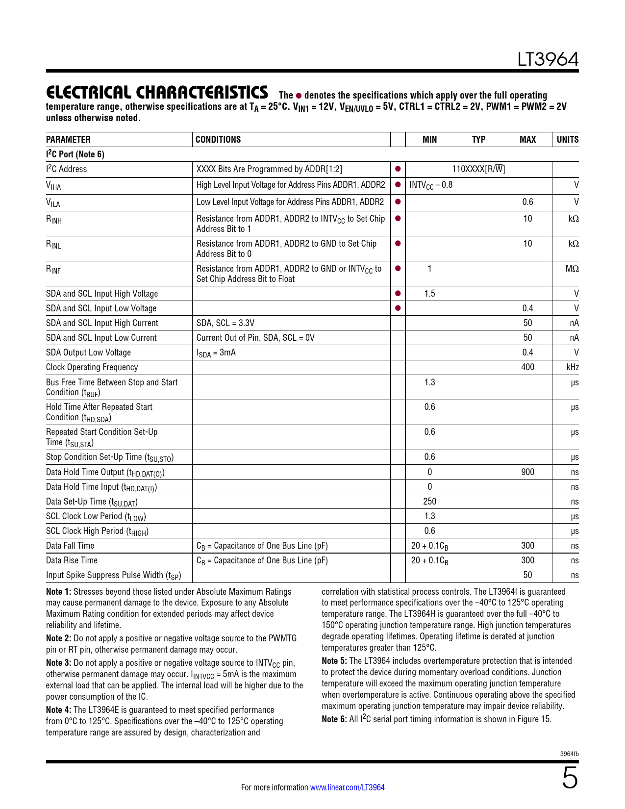 LT3964 ELECTRICALCHARACTERISTICS The l denotes the specifications which apply over the full operatingtemperature range, otherwise specifications are at TA = 25°C. VIN1 = 12V, VEN/UVLO = 5V, CTRL1 = CTRL2 = 2V, PWM1 = PWM2 = 2Vunless otherwise noted.PARAMETERCONDITIONSMINTYPMAXUNITSI2C Port (Note 6) I2C Address XXXX Bits Are Programmed by ADDR[1:2] l 110XXXX[R/W] VIHA High Level Input Voltage for Address Pins ADDR1, ADDR2 l INTVCC – 0.8 V VILA Low Level Input Voltage for Address Pins ADDR1, ADDR2 l 0.6 V RINH Resistance from ADDR1, ADDR2 to INTVCC to Set Chip l 10 kΩ Address Bit to 1 RINL Resistance from ADDR1, ADDR2 to GND to Set Chip l 10 kΩ Address Bit to 0 RINF Resistance from ADDR1, ADDR2 to GND or INTVCC to l 1 MΩ Set Chip Address Bit to Float SDA and SCL Input High Voltage l 1.5 V SDA and SCL Input Low Voltage l 0.4 V SDA and SCL Input High Current SDA, SCL = 3.3V 50 nA SDA and SCL Input Low Current Current Out of Pin, SDA, SCL = 0V 50 nA SDA Output Low Voltage ISDA = 3mA 0.4 V Clock Operating Frequency 400 kHz Bus Free Time Between Stop and Start 1.3 µs Condition (tBUF) Hold Time After Repeated Start 0.6 µs Condition (tHD,SDA) Repeated Start Condition Set-Up 0.6 µs Time (tSU,STA) Stop Condition Set-Up Time (tSU,STO) 0.6 µs Data Hold Time Output (tHD,DAT(O)) 0 900 ns Data Hold Time Input (tHD,DAT(I)) 0 ns Data Set-Up Time (tSU,DAT) 250 ns SCL Clock Low Period (tLOW) 1.3 µs SCL Clock High Period (tHIGH) 0.6 µs Data Fall Time CB = Capacitance of One Bus Line (pF) 20 + 0.1CB 300 ns Data Rise Time CB = Capacitance of One Bus Line (pF) 20 + 0.1CB 300 ns Input Spike Suppress Pulse Width (tSP) 50 ns Note 1: Stresses beyond those listed under Absolute Maximum Ratings correlation with statistical process controls. The LT3964I is guaranteed may cause permanent damage to the device. Exposure to any Absolute to meet performance specifications over the –40°C to 125°C operating Maximum Rating condition for extended periods may affect device temperature range. The LT3964H is guaranteed over the full –40°C to reliability and lifetime. 150°C operating junction temperature range. High junction temperatures Note 2: Do not apply a positive or negative voltage source to the PWMTG degrade operating lifetimes. Operating lifetime is derated at junction pin or RT pin, otherwise permanent damage may occur. temperatures greater than 125°C. Note 3: Do not apply a positive or negative voltage source to INTV Note 5: The LT3964 includes overtemperature protection that is intended CC pin, otherwise permanent damage may occur. I to protect the device during momentary overload conditions. Junction INTVCC = 5mA is the maximum external load that can be applied. The internal load will be higher due to the temperature will exceed the maximum operating junction temperature power consumption of the IC. when overtemperature is active. Continuous operating above the specified Note 4: The LT3964E is guaranteed to meet specified performance maximum operating junction temperature may impair device reliability. from 0°C to 125°C. Specifications over the –40°C to 125°C operating Note 6: All I2C serial port timing information is shown in Figure 15. temperature range are assured by design, characterization and 3964fb For more information www.linear.com/LT3964 5